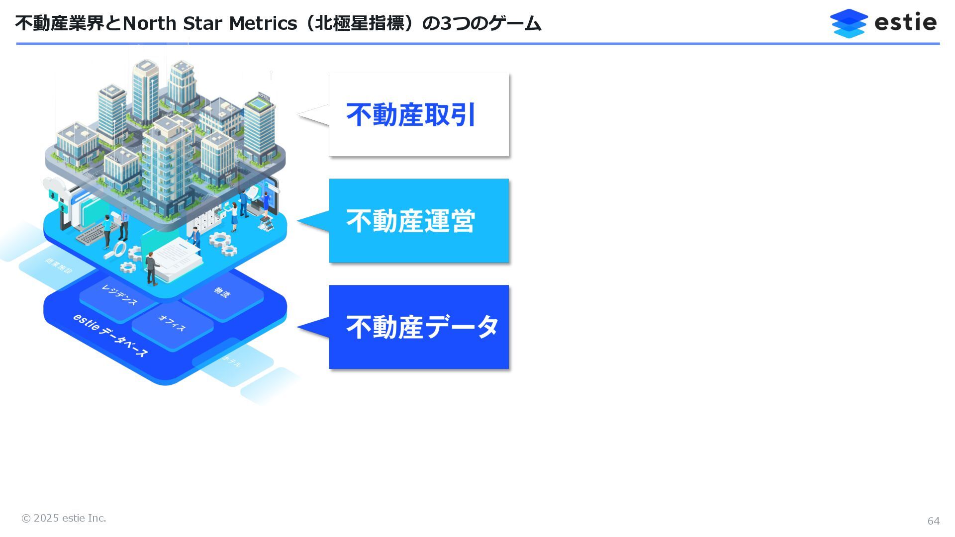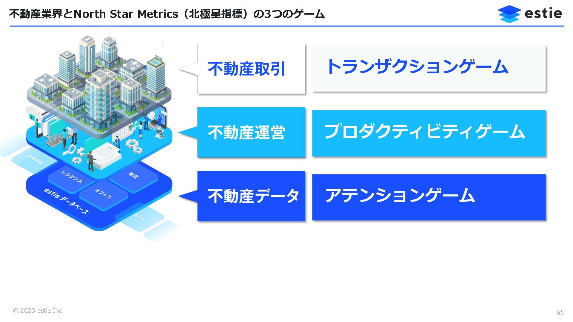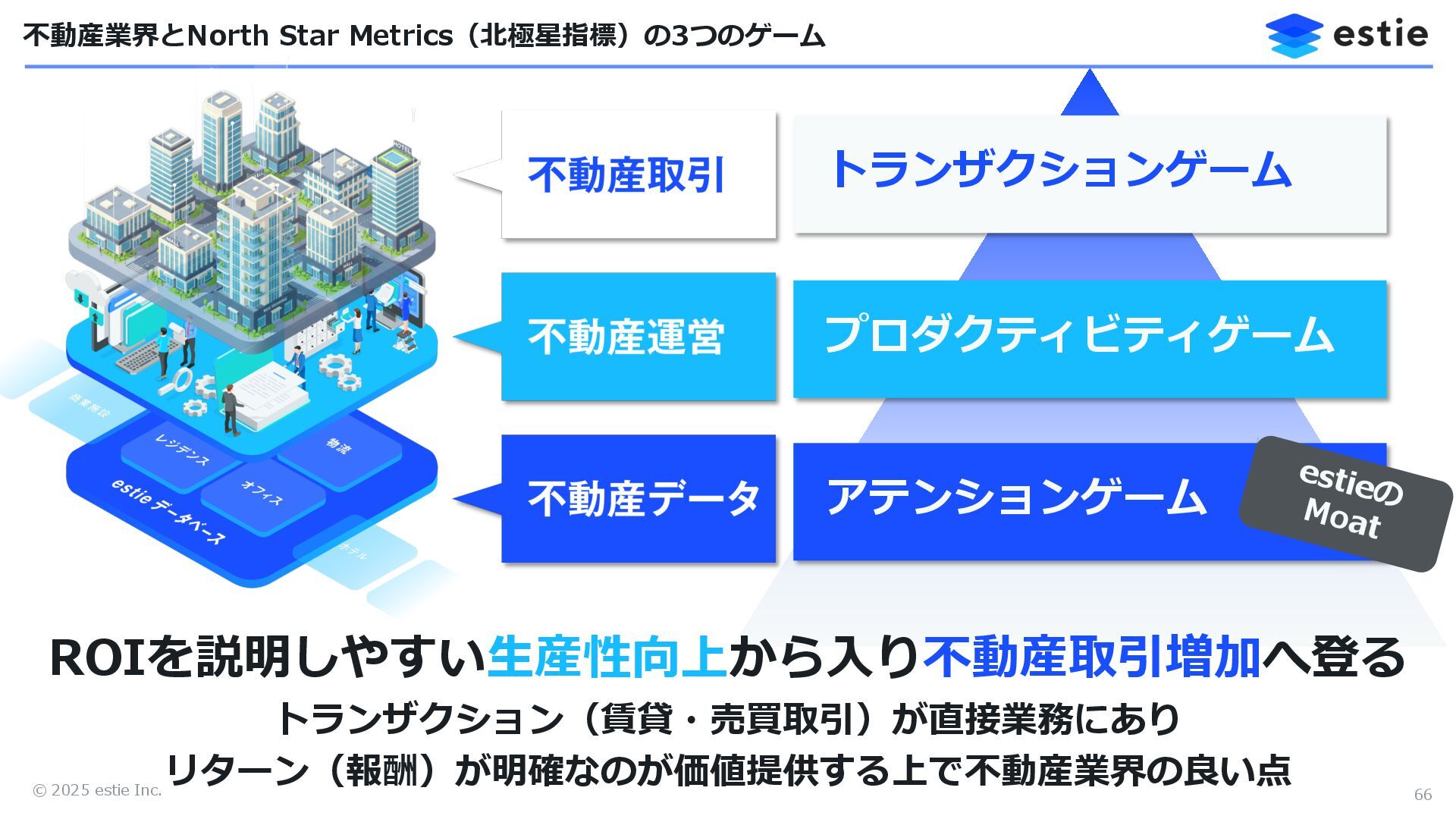 20. © 2025 estie Inc. 不動産業界とNorth Star Metrics(北極星指標)の3つのゲーム 66 ROIを説明しやすい⽣産性向上から⼊り不動産取引増加へ登る トランザクション(賃貸・売買取引)が直接業務にあり