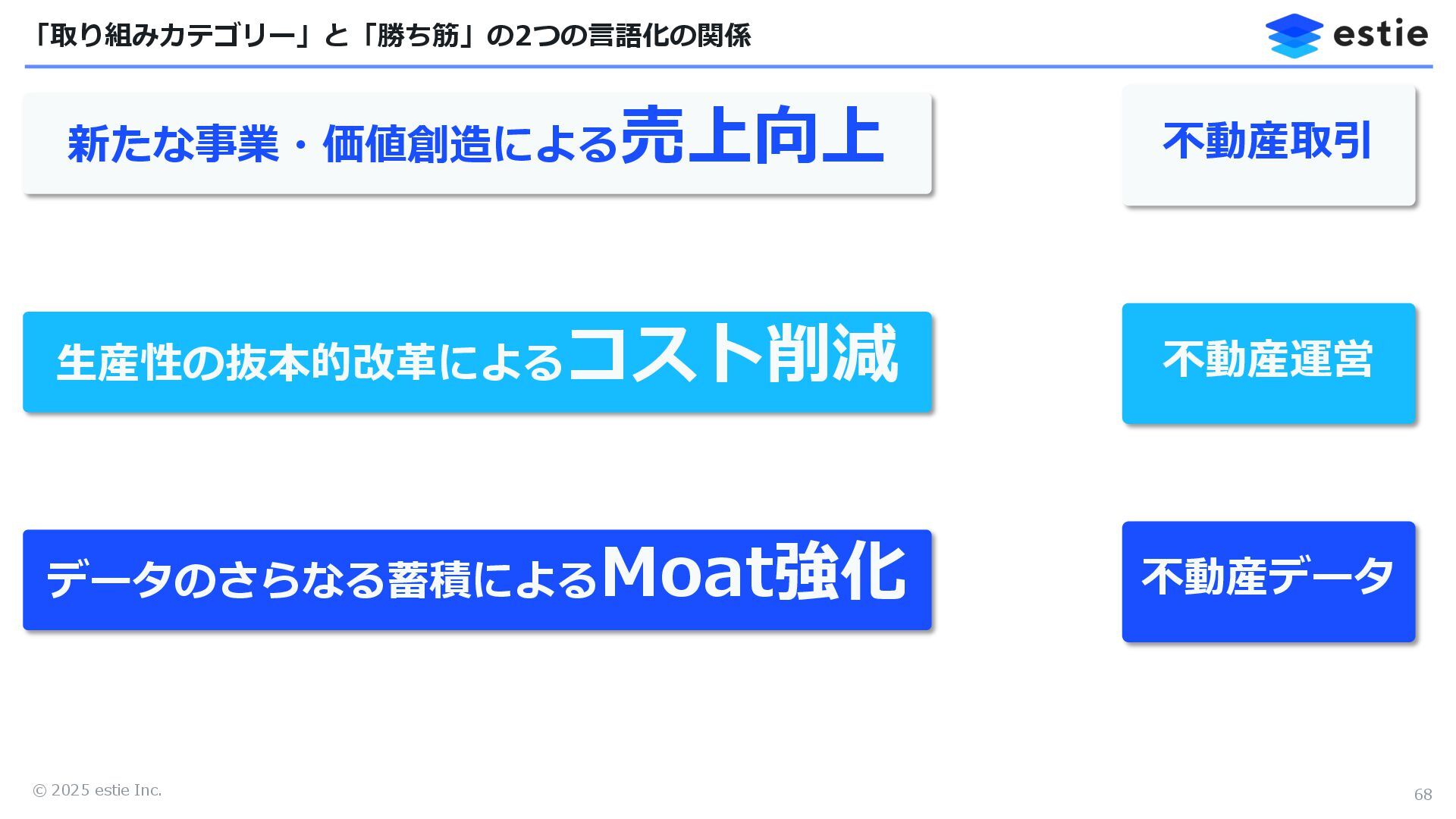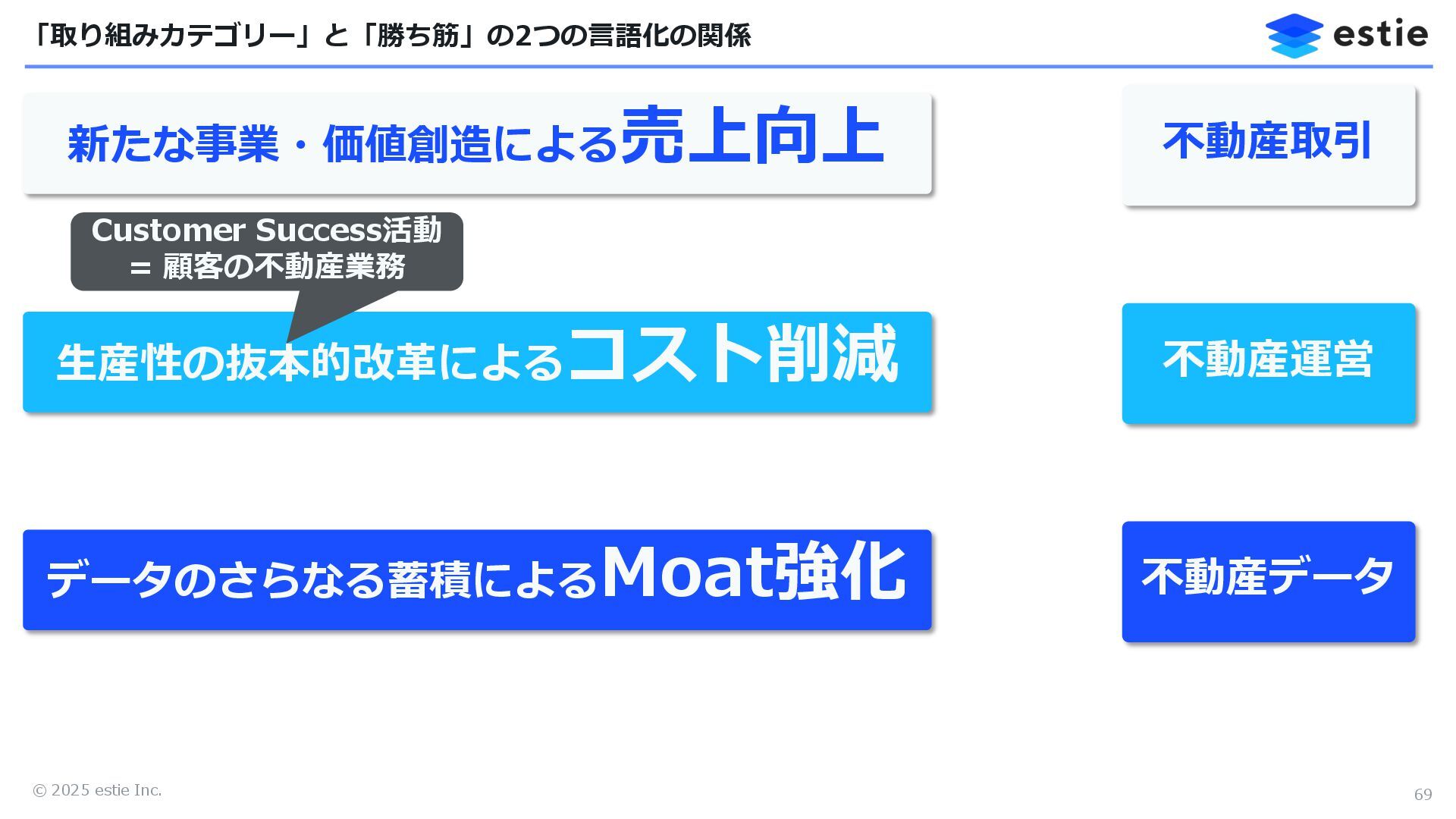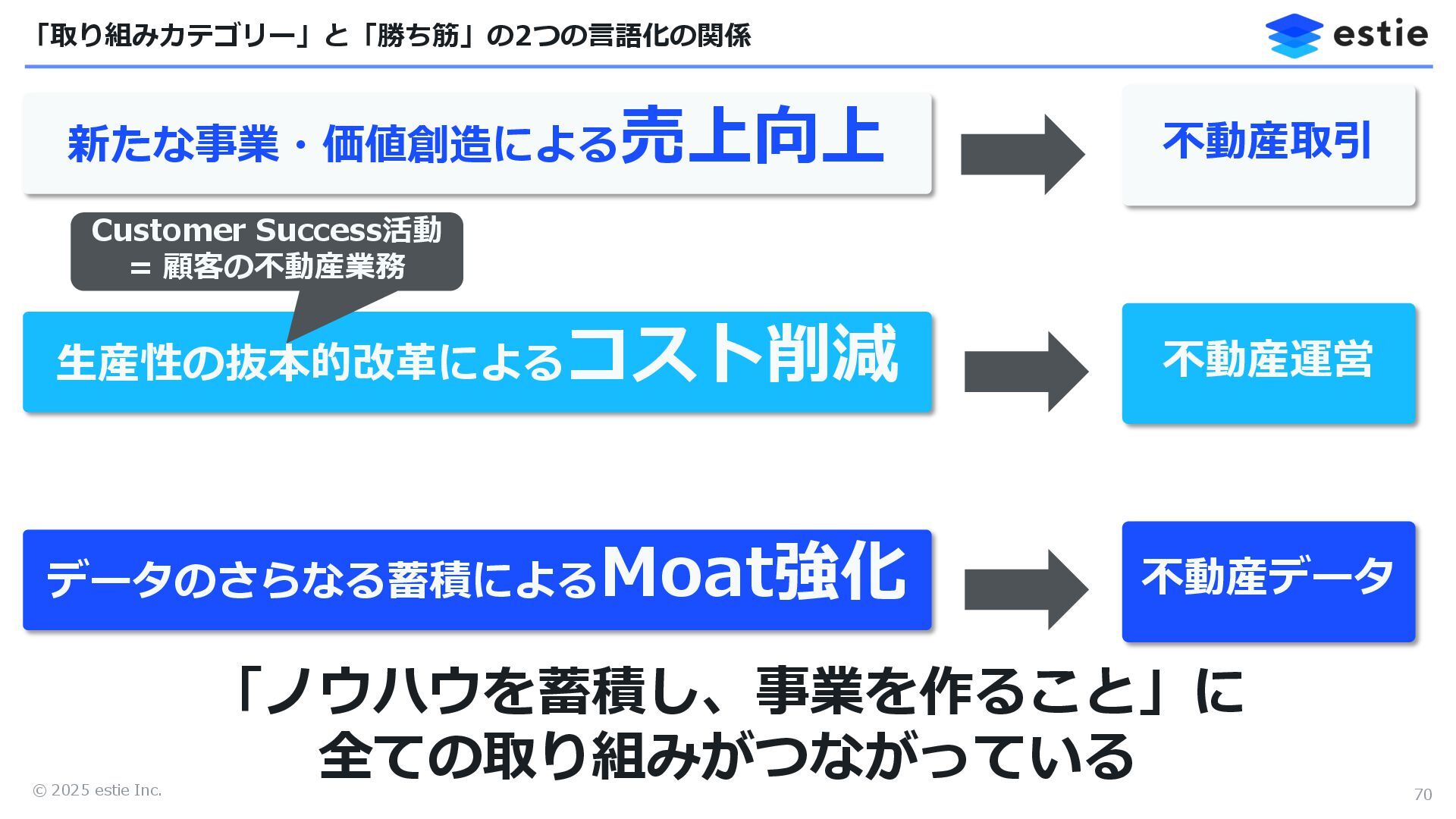 21. © 2025 estie Inc. 「取り組みカテゴリー」と「勝ち筋」の2つの⾔語化の関係 70 新たな事業・価値創造による売上向上 不動産取引 ⽣産性の抜本的改⾰によるコスト削減 不動産運営