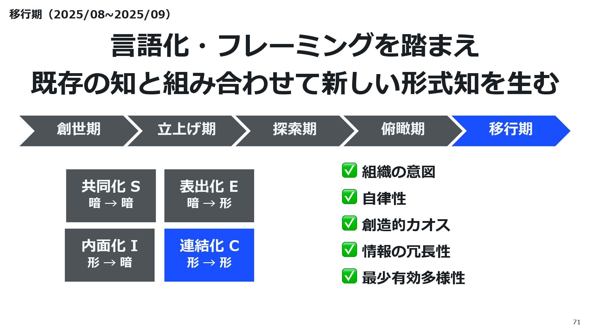 移⾏期 ⾔語化・フレーミングを踏まえ 既存の知と組み合わせて新しい形式知を⽣む 共同化 S 暗 → 暗 表出化 E 暗 → 形 内⾯化 I 形 → 暗 連結化 C 形 → 形 ✅ 組織の意図 ✅ ⾃律性 ✅ 創造的カオス ✅ 情報の冗⻑性 ✅ 最少有効多様性