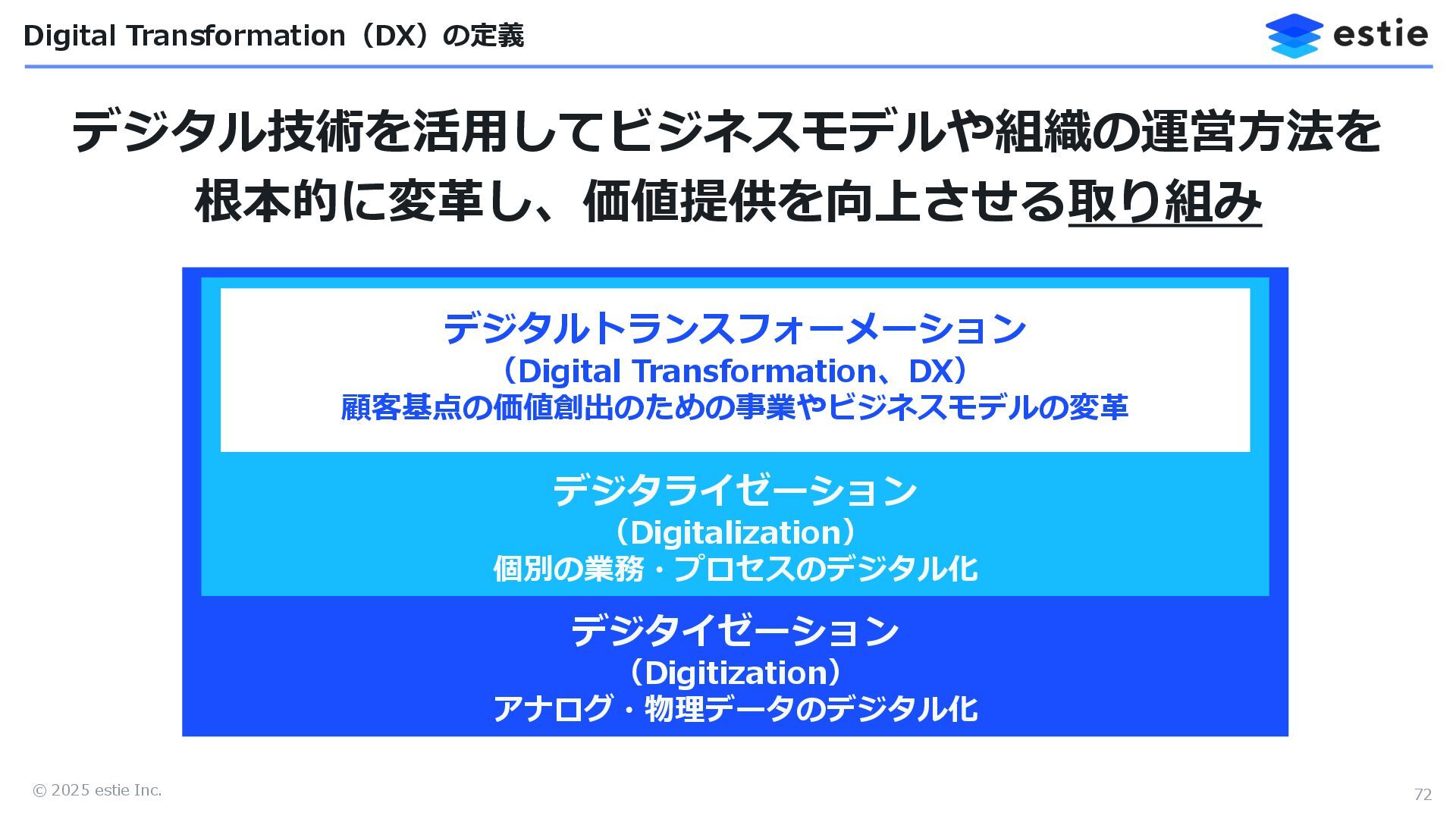 23. © 2025 estie Inc. デジタル技術を活⽤してビジネスモデルや組織の運営⽅法を 根本的に変⾰し、価値提供を向上させる取り組み Digital Transformation(DX)の定義 72 デジタイゼーション