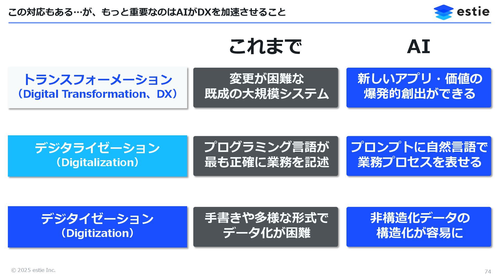 25. © 2025 estie Inc. この対応もある…が、もっと重要なのはAIがDXを加速させること 74 デジタイゼーション (Digitization) デジタライゼーション (Digitalization)