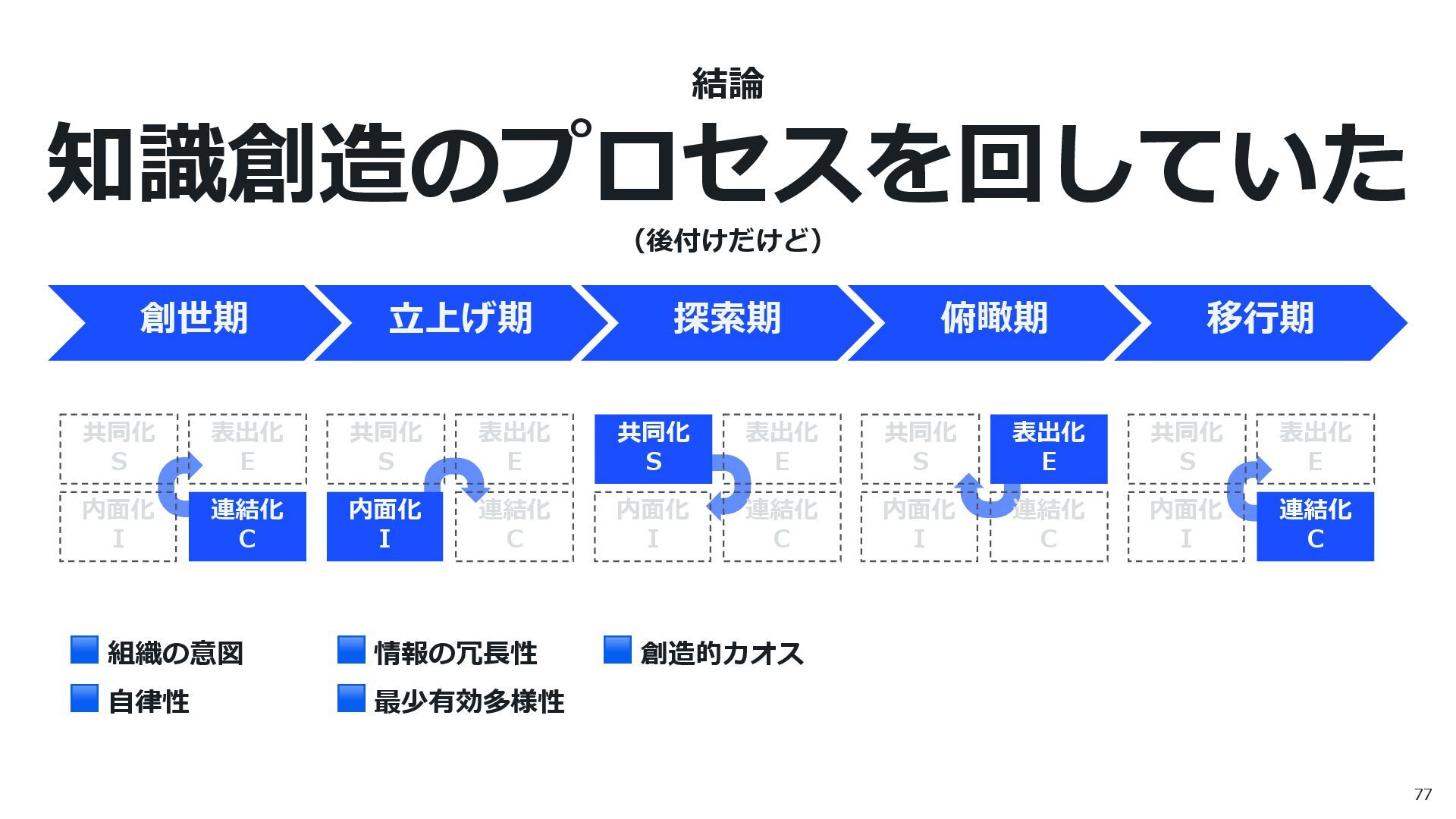 移⾏期 知識創造のプロセスを回していた 🟦 組織の意図 🟦 ⾃律性 🟦 情報の冗⻑性 🟦 最少有効多様性 🟦 創造的カオス 共同化 S 表出化 E 内⾯化 I 連結化 C 共同化 S 表出化 E 内⾯化 I 連結化 C 共同化 S 表出化 E 内⾯化 I 連結化 C 共同化 S 表出化 E 内⾯化 I 連結化 C 共同化 S 表出化 E 内⾯化 I 連結化 C 結論