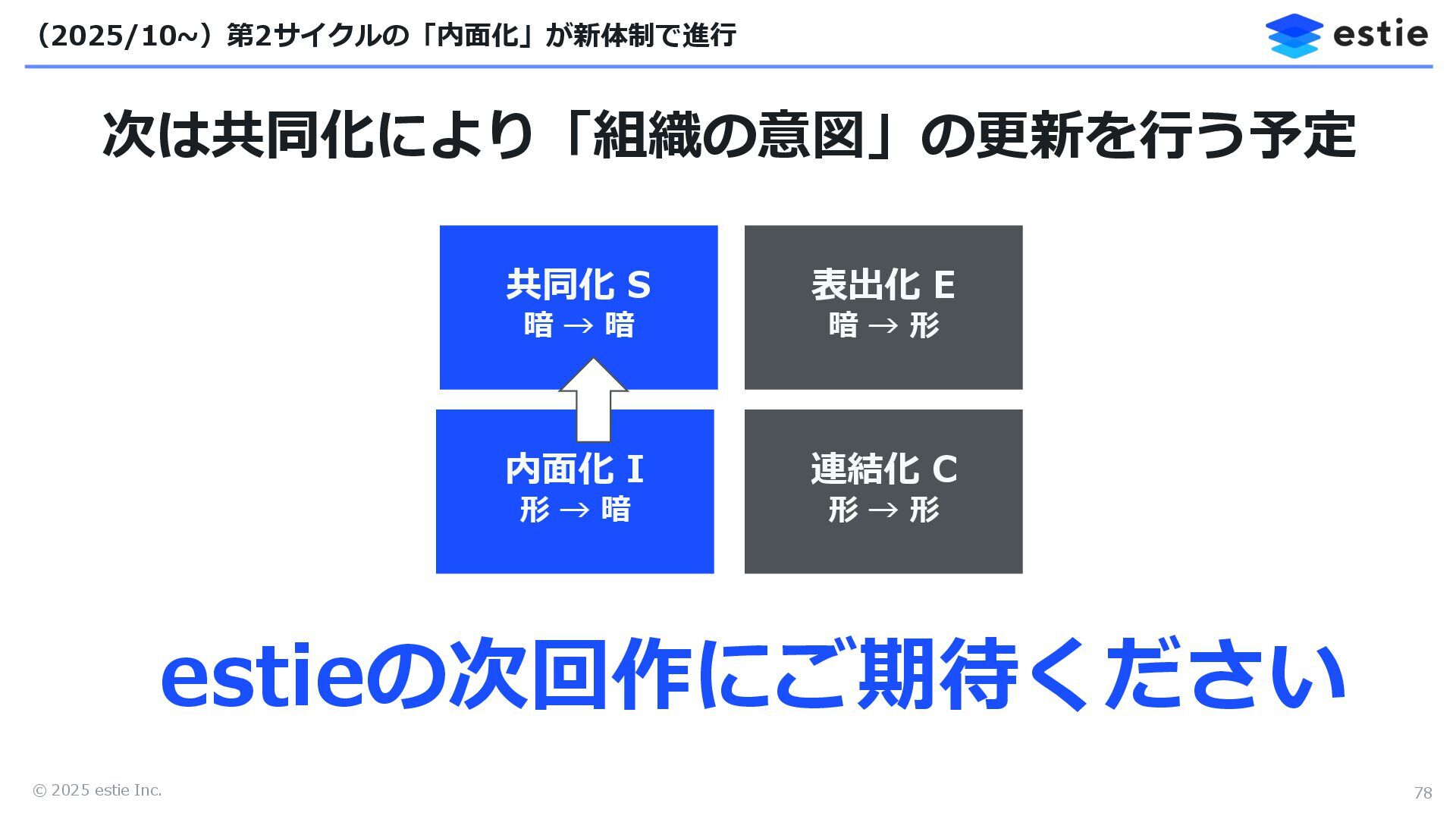 暗 表出化 E 暗 → 形 内⾯化 I 形 → 暗 連結化 C 形 → 形 次は共同化により「組織の意図」の更新を⾏う予定 estieの次回作にご期待ください