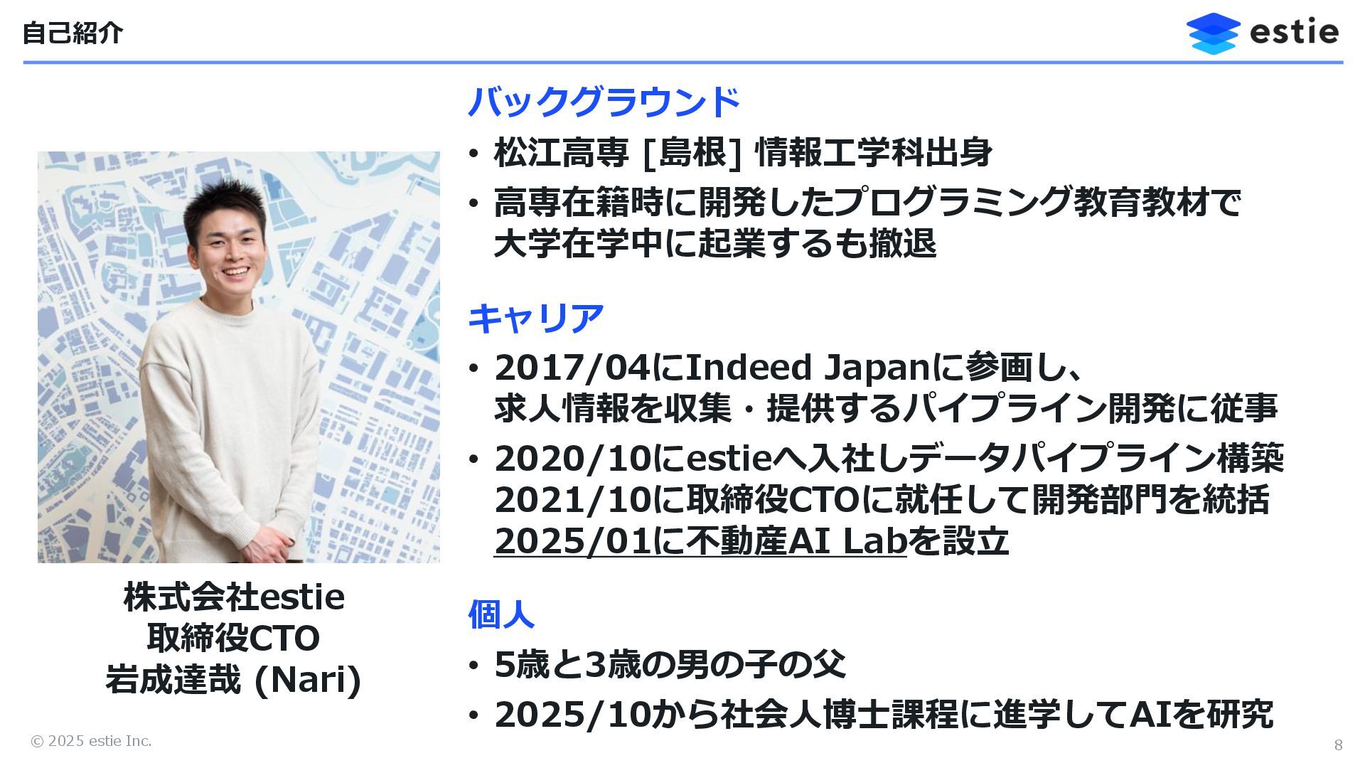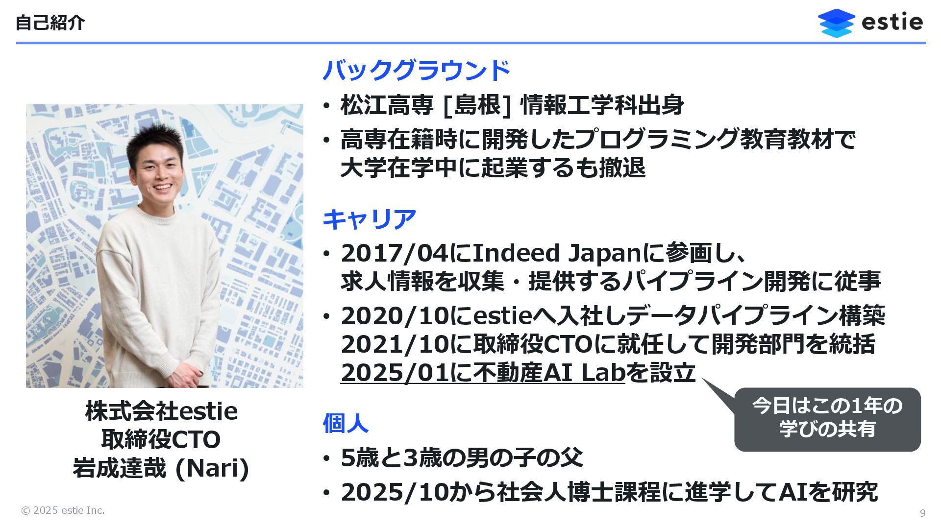 ⾼専在籍時に開発したプログラミング教育教材で ⼤学在学中に起業するも撤退 キャリア • 2017/04にIndeed Japanに参画し、 求⼈情報を収集・提供するパイプライン開発に従事 • 2020/10にestieへ⼊社しデータパイプライン構築 2021/10に取締役CTOに就任して開発部⾨を統括 2025/01に不動産AI Labを設⽴ 個⼈ • 5歳と3歳の男の⼦の⽗ • 2025/10から社会⼈博⼠課程に進学してAIを研究 ⾃⼰紹介 8 株式会社estie 取締役CTO 岩成達哉 (Nari)