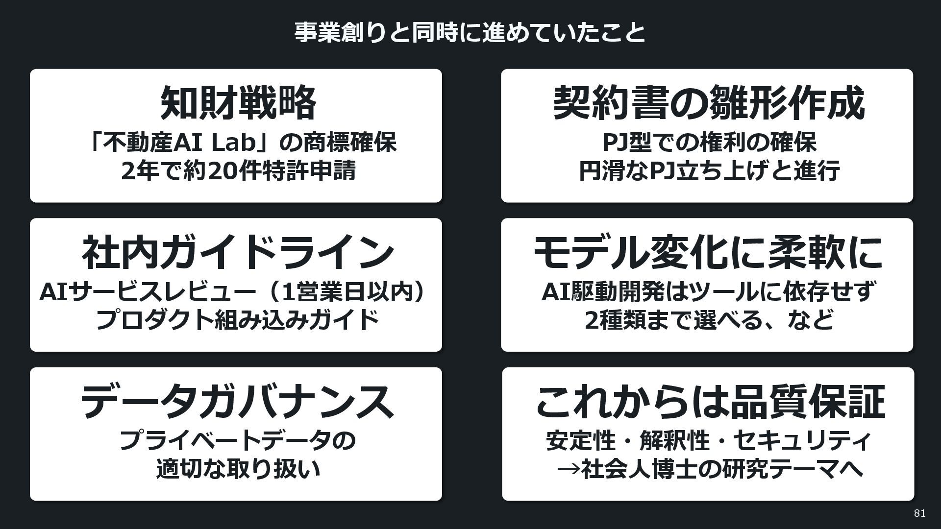 契約書の雛形作成 PJ型での権利の確保 円滑なPJ⽴ち上げと進⾏ 社内ガイドライン AIサービスレビュー(1営業⽇以内) プロダクト組み込みガイド モデル変化に柔軟に AI駆動開発はツールに依存せず 2種類まで選べる、など データガバナンス プライベートデータの 適切な取り扱い これからは品質保証 安定性・解釈性・セキュリティ →社会⼈博⼠の研究テーマへ