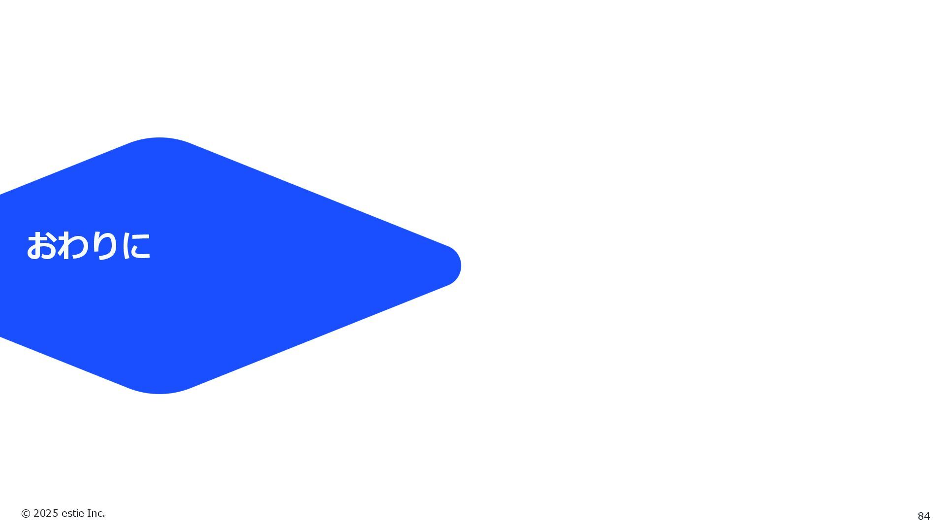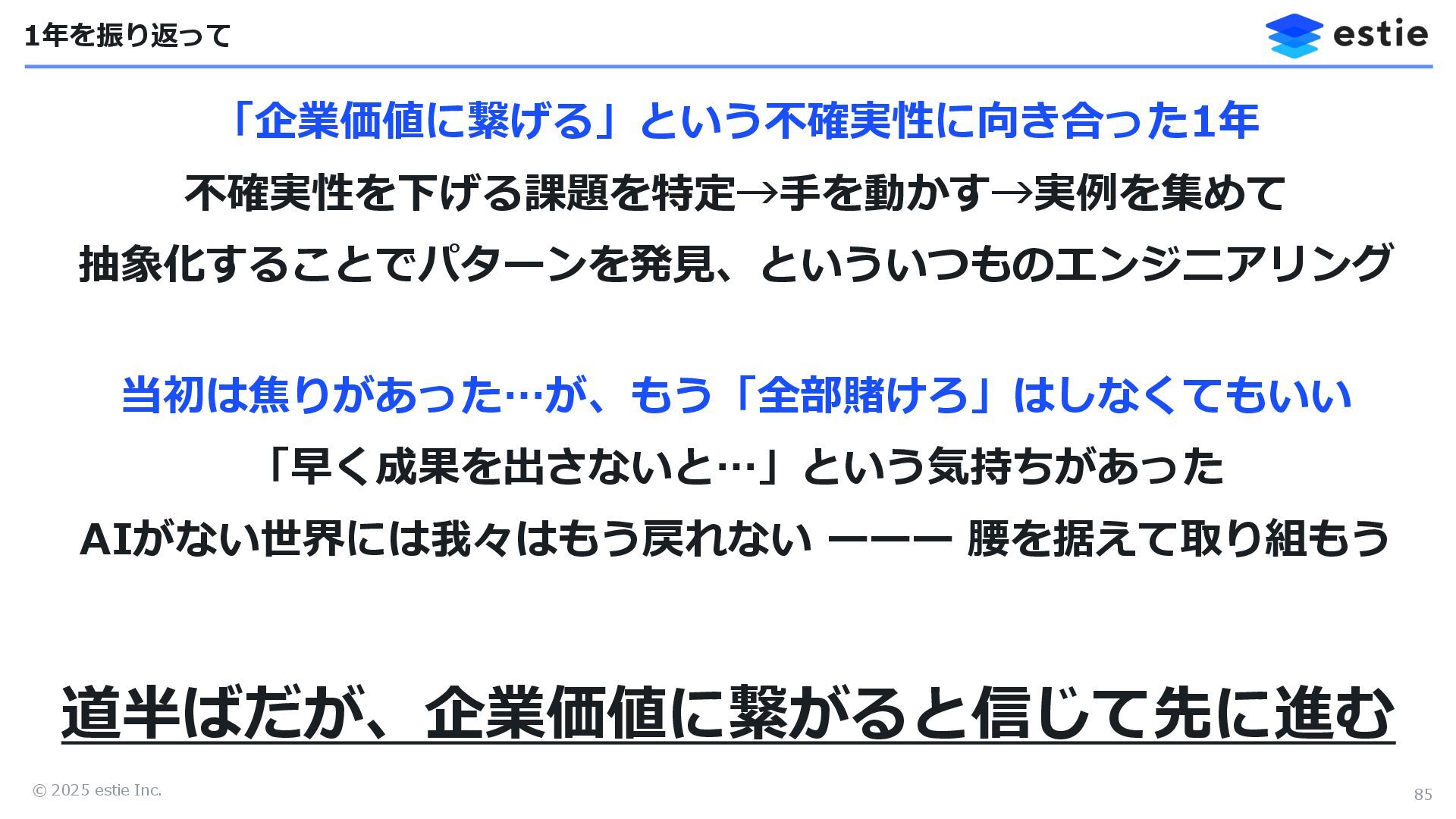 30. © 2025 estie Inc. 道半ばだが、企業価値に繋がると信じて先に進む 1年を振り返って 85 「企業価値に繋げる」という不確実性に向き合った1年 不確実性を下げる課題を特定→⼿を動かす→実例を集めて 抽象化することでパターンを発⾒、といういつものエンジニアリング