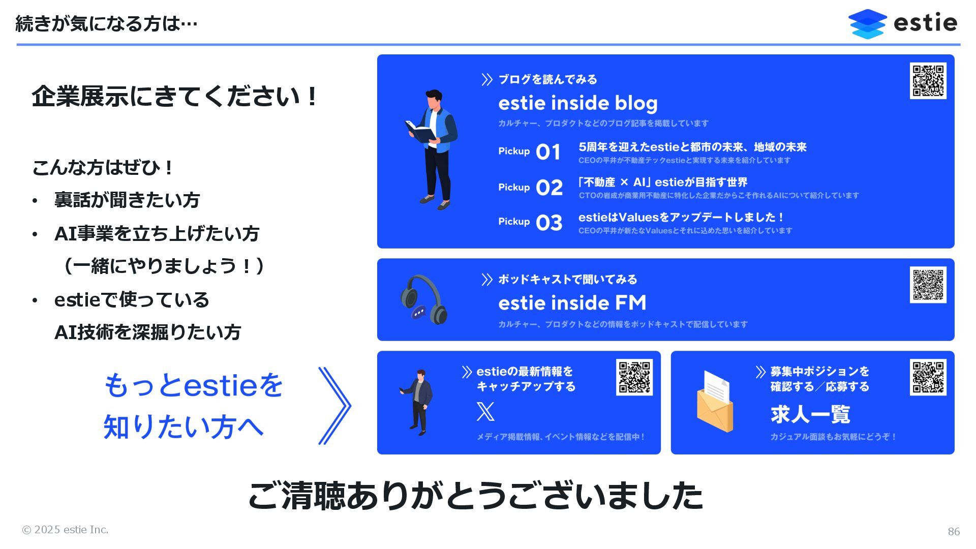 31. © 2025 estie Inc. 続きが気になる⽅は… 86 企業展⽰にきてください︕ こんな⽅はぜひ︕ • 裏話が聞きたい⽅
