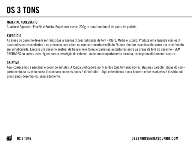 e Paleta. Papel pelo menos 200g e uma thumbnail de ponto de partida. EXERCÍCIO As áreas do desenho devem ser reduzidas a apenas 3 possibilidades de tom - Claro, Médio e Escuro. Produza uma legenda com os 3 quadrados correspondentes e os preencha com o tom ou comportamento escolhido. Vamos abordar esse desenho como um experimento em simplicidade. Execute um desenho gestual de base e nele formule barreiras autorítárias entre as áreas de tom do desenho - SEM DEGRADÊS ou outras estratégias para a descrição de volume - onde um comportamento termina, começa imediatamente o outro. OBJETIVO Aqui começamos a perceber o poder do simples: A lógica unificadora por trás dos tons tornarâo óbvias algumas características do com- portamento da luz e do nosso ilusionismo sobre as quais é difícil falar - Aqui entendemos que a barreira entre os objetos é ilusória não precisamos desenha-los separadamente. OS 3 TONS