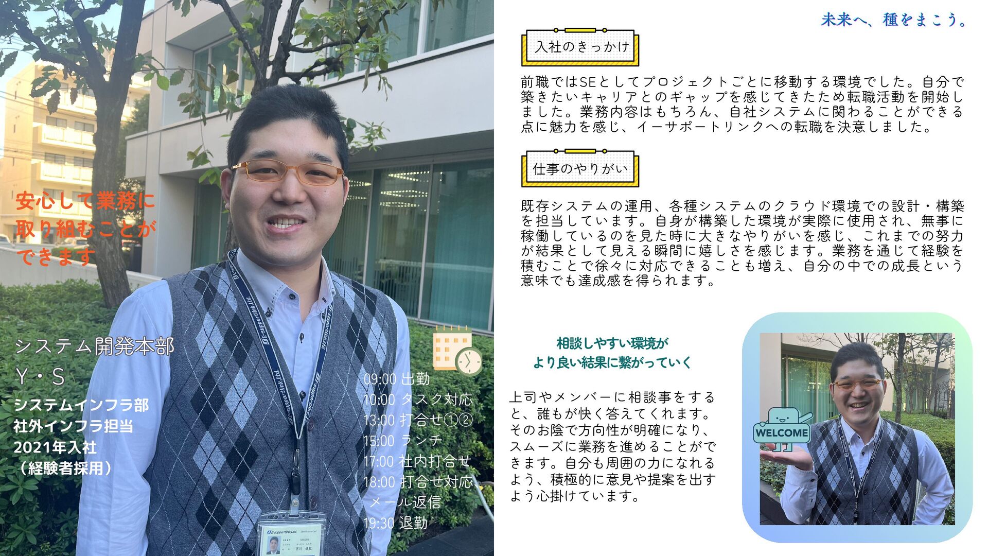 当 し て い ま す。農業、特に青果物に興味があ り、社会人になってからこれまで ずっと、青果物に関わる仕事に携 わっております。今後は自身の能 力を高めながら、関係者の方々・ 農業・社会への貢献度を高めたい です。他部署の事業や人員との連 携も深めて、社会貢献度の高い仕 事を創出できればと思います。 アグリビジネス本部 アグリビジネス本部 S・Y S・Y アグリ営業部 部長 2020年入社 (経験者採用) 食に関わる仕事を通して 生産者・生活者に貢献していきたい 業務内容 未来へ、種をまこう。 未来へ、種をまこう。 未来へ、種をまこう。 プライベートは家族との時間を 最優先にしています 営業職なので外出や出張の予 定も少なくないですが、優先 度を意識しながら業務を行 い、なるべく家族との時間を 多く作れるようにしておりま す。有給休暇や時間休暇、在 宅勤務なども利用して調整し ています。 育児休暇も取得することがで き、子育てにも積極的に関わ ることができています。 09:00 出勤 メール確認・返信 10:00 仕入先・販売先との やりとり、承認業務、 商談・打合せ資料作成 12:00 昼食 13:00 店舗視察 14:00 商談 15:00 商談報告書作成 今後の取り進め確認及び 関係先への相談 16:30 仕入・販売内容整理 (入力等)、予実管理 17:30 業務整理・進捗確認、 スケジュール確認等 18:00 退勤