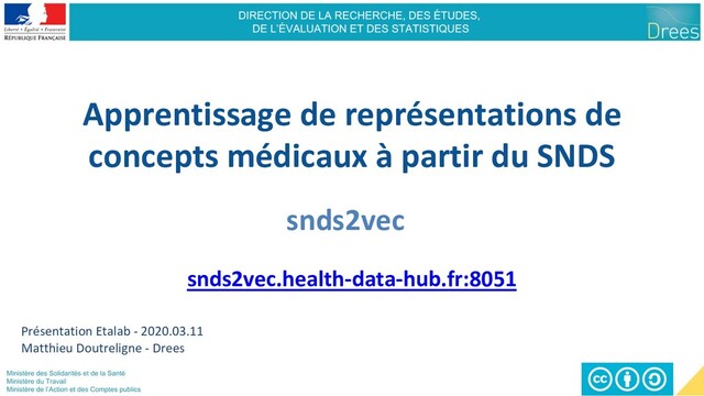 Y.-I. Chiu, et D. Sontag, « Learning Low-Dimensional Representations of Medical Concepts », AMIA Jt Summits Transl Sci Proc. 2016, p. 41–50, 2016. - A. L. Beam et al., « Clinical Concept Embeddings Learned from Massive Sources of Multimodal Medical Data », arXiv:1804.01486 [cs, stat], avr. 2018. Références sur word2vec en langages : - T. Mikolov, I. Sutskever, K. Chen, G. S. Corrado, et J. Dean, « Distributed Representations of Words and Phrases and their Compositionality », Nips process, vol. 2013, p. 9. - O. Levy et Y. Goldberg, « Neural Word Embedding as Implicit Matrix Factorization », Nips process, vol. 2014, p. 9 Codes : - SNDS2vec webapp, exploration : - lien externe : http://snds2vec.health-data-hub.fr:8051/ - Code source application : https://gitlab.com/DREES_code/OSAM/appli_snds2vec_fr - Notebook d’explorations (python) : https://gitlab.com/DREES_code/OSAM/snds2vec_analyse