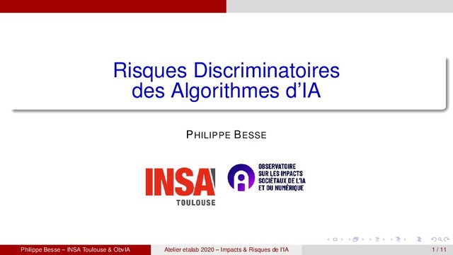 A. (2016). Big Data’s Disparate Impact, California Law Review (104), 671. Besse P. (2020). D´ etecter, ´ evaluer les risques des impacts discriminatoires des algorithmes d’IA , HAL preprint. Besse P., Castets-Renard C., Garivier A., Loubes J.-M. (2019). L’IA du Quotidien peut elle ˆ etre ´ Ethique? Loyaut´ e des Algorithmes d’Apprentissage Automatique, Statistique et Soci´ et´ e, Vol 6 (3), pp 9-31. Besse P., Besse Patin A., Castets Renard C. (2019). Implications juridiques et ´ ethiques des algorithmes d’intelligence artificielle dans le domaine de la sant´ e, soumis, HAL preprint. CNIL, D´ efenseur des Droits (2012). Mesurer pour progresser vers l’´ egalit´ e des chances, Guide m´ ethodologique ` a l’usage des acteurs de l’emploi. Challe L., Chareyron S., L’Horty Y., Petit P. (2020). Discrimination dans le recrutement des grandes entreprises: une approche multicanal, rapport de recherche TEPP 2020-01. Code of Federal Regulations (1978). Title 29 - Labor PART 1607—UNIFORM GUIDELINES ON EMPLOYEE SELECTION PROCEDURES (1978), CHAPTER XIV - EQUAL EMPLOYMENT OPPORTUNITY COMMISSION. Commission Europ´ eenne (2018). Ethics guidelines for trustworthy AI. Commission Europ´ eenne (2020). White Paper on Artificial Intelligence: a European approach to excellence and trust. D´ efenseur des Droits, CNIL (2012). Mesurer pour progresser vers l’´ egalit´ e des chances. Guide m´ ethodologique ` a l’usage des acteurs de l’emploi. Riach P.A., Rich J. (2002). Field Experiments of Discrimination in the Market Place, The Economic Journal, Vol. 112 (483), pp F480-F518. Zliobait´ e I. (2017). Measuring discrimination in algorithmic decision making. Data Min Knowl Disc 31, 1060–1089. doi.org/10.1007/s10618-017-0506-1. Philippe Besse – INSA Toulouse & ObvIA Atelier etalab 2020 – Impacts & Risques de l’IA 11 / 11