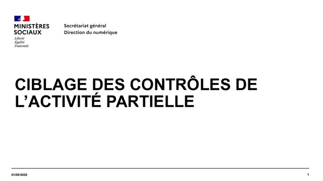 APART (DGEFP) • Demande des entreprises (DAP / DA / DI) • Base SIRENE (INSEE) • Données entreprises /établissements • Base DSN-RCD (ACOSS) • Effectifs ETP et Physique • BASE DSN (GIP-Mds) : • Somme du travail rémunéré et des absences non rémunérés par établissement • IJ (CNAM et CCMSA) • Données fiscales d’activité (DGFIP) 01/09/2020 Données & Règles de ciblage utilisés Exemples Règles : 1. SIRET inexistant 2. Etablissement fermé 3. … Réalisé En cours A l’étude Au total, plus d’une dizaine de règles ont été mises en place APART