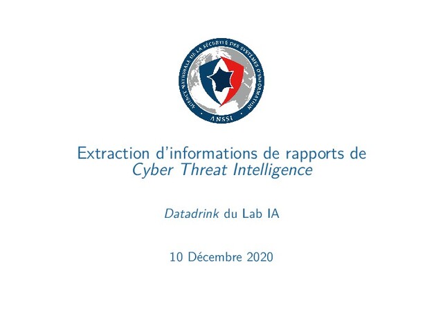 en deux étapes : ▶ Pré-traitement générique (hyphenation, références, espaces,...) ▶ Pré-traitement spécifique : 1 Noms de codes malveillants, de modes opératoires... 2 Règles spécifiques (expressions régulières) 2 Extraction : utilisation de SpaCy. 3 Normalisation : texte en minuscule et “lemmatized”, prise en compte de synonymes, suppression des tokens inutiles. 8/12