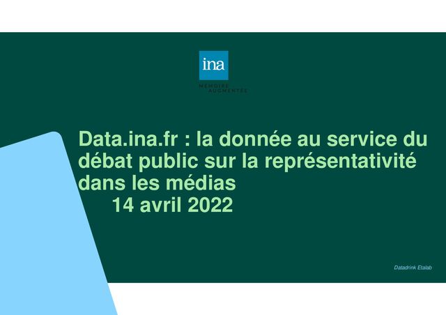 avril 2022 Les enjeux du projet Définir des indicateurs pertinents, objectivables et partagés pour l'analyse des médias audiovisuels sur le temps long. Rationaliser et industrialiser les traitements automatiques permettant de les produire sur des volumes importants. Développer des interfaces de data-visualisation ouvertes et paramétrables, et des tableaux de bord synthétiques accessibles à tous. Proposer des analyses visuelles et éditorialisées régulières pour favoriser l'intelligibilité des évolutions à l'œuvre dans les médias audiovisuels. Ouvrir et mettre à disposition avec une licence libre des indicateurs et les données associées. S’assurer de la qualité des données, en amont pour les référentiels et les corpus d’entraînement et en aval pour les données générées ou produites.