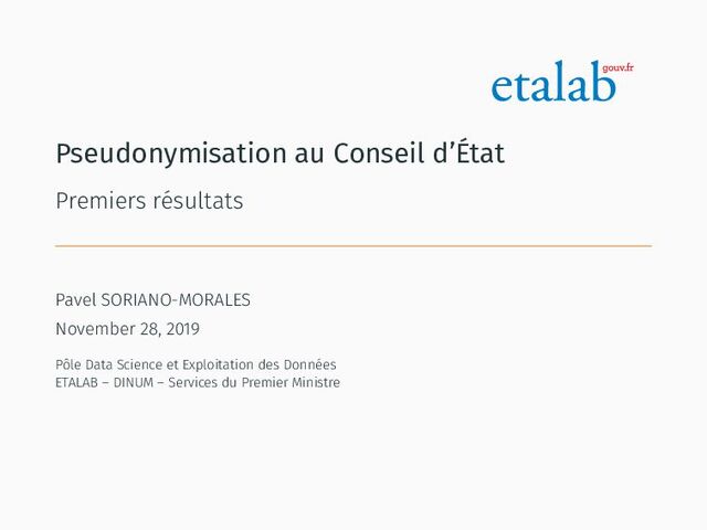 justice au grand public, • Pour y arriver, on doit supprimer les informations sensibles, • La solution existante fonctionne à base de règles (regex) et dictionnaires (noms/prénoms), • Une solution fondée sur le Traitement Automatique du Langage Naturel (TALN, ou NLP en anglais) pourrait fournir une solution plus flexible et performante. • Etalab accompagne le Conseil d’État avec une première approche de la pseudonymisation avec du NLP. 1
