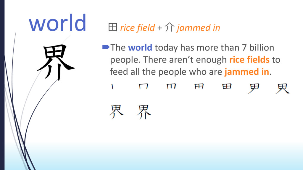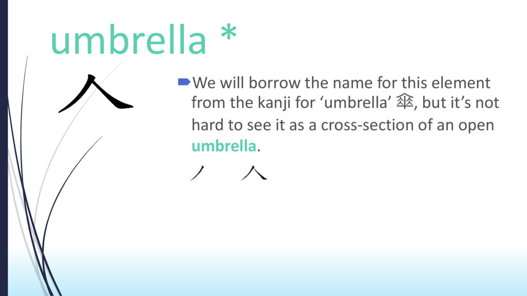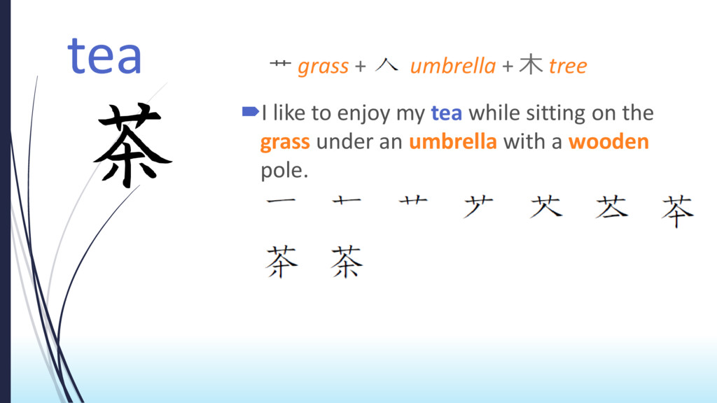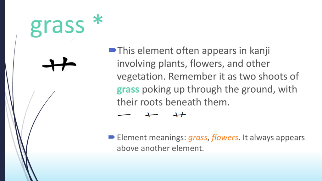 flowers, and other vegetation. Remember it as two shoots of grass poking up through the ground, with their roots beneath them. Element meanings: grass, flowers. It always appears above another element.