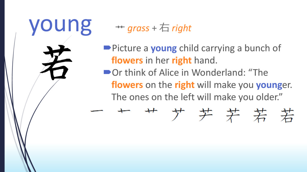 carrying a bunch of flowers in her right hand. Or think of Alice in Wonderland: “The flowers on the right will make you younger. The ones on the left will make you older.”