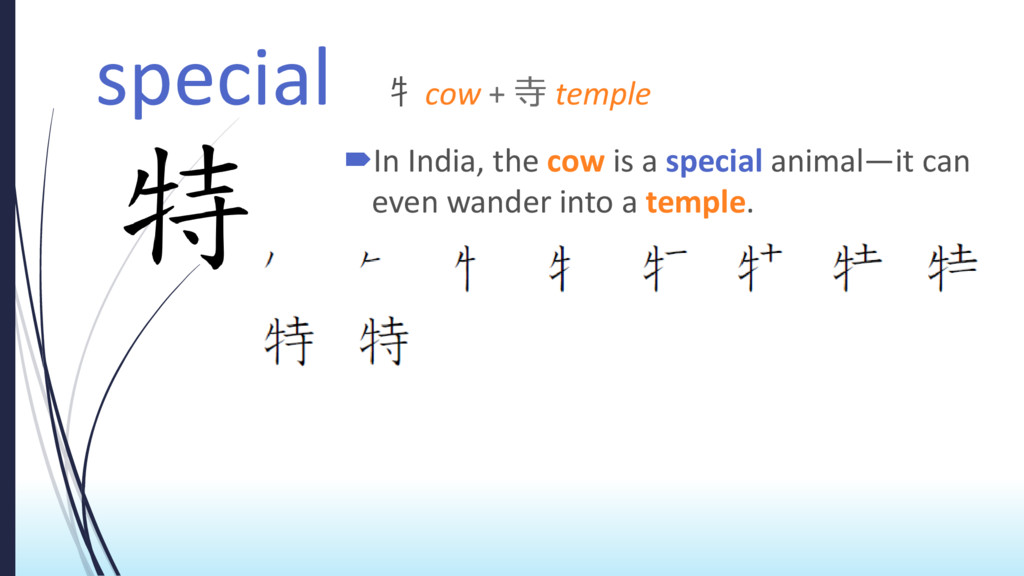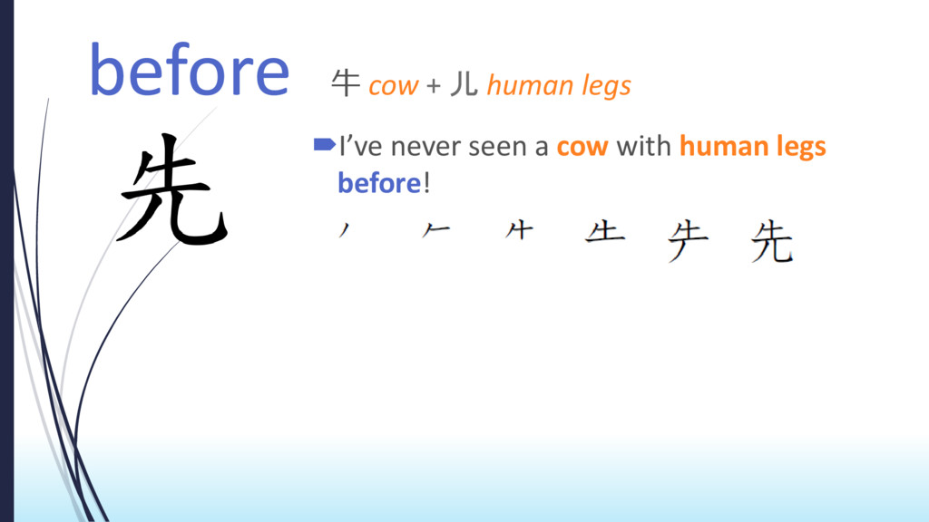 left is a horn. The first horizontal line is the top of the head; the second is the eyes. The vertical line adds the other horn and the nose. Note that the stroke order changes when cow appears as a left-hand element: the second horizontal line is drawn last and slanted up. Above another element, the bottom stroke is cut short, as in 告 or 先.