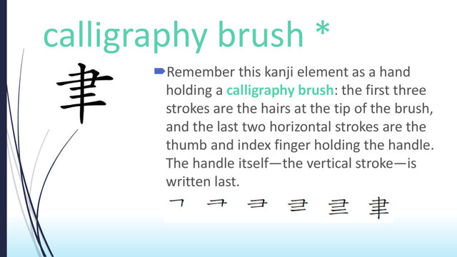 holding a calligraphy brush: the first three strokes are the hairs at the tip of the brush, and the last two horizontal strokes are the thumb and index finger holding the handle. The handle itself—the vertical stroke—is written last.