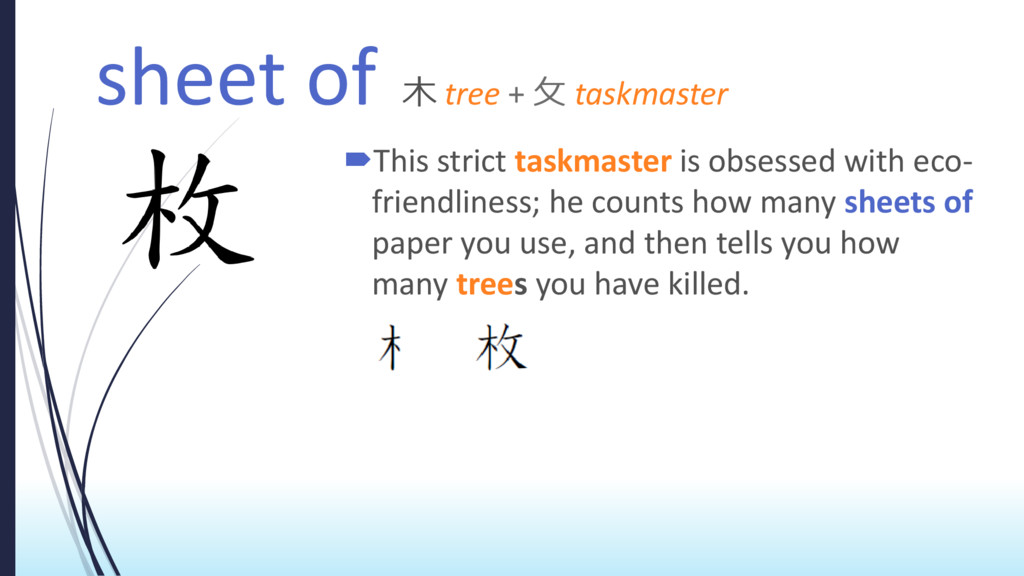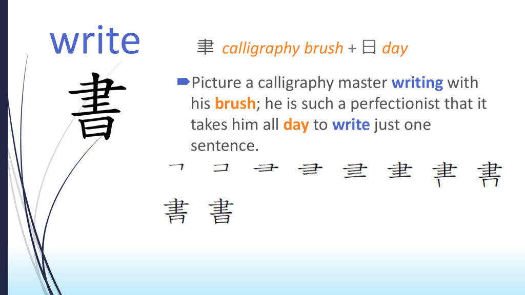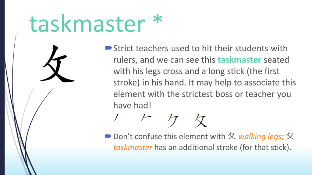 rulers, and we can see this taskmaster seated with his legs cross and a long stick (the first stroke) in his hand. It may help to associate this element with the strictest boss or teacher you have had! Don’t confuse this element with 夂 walking legs; 攵 taskmaster has an additional stroke (for that stick).