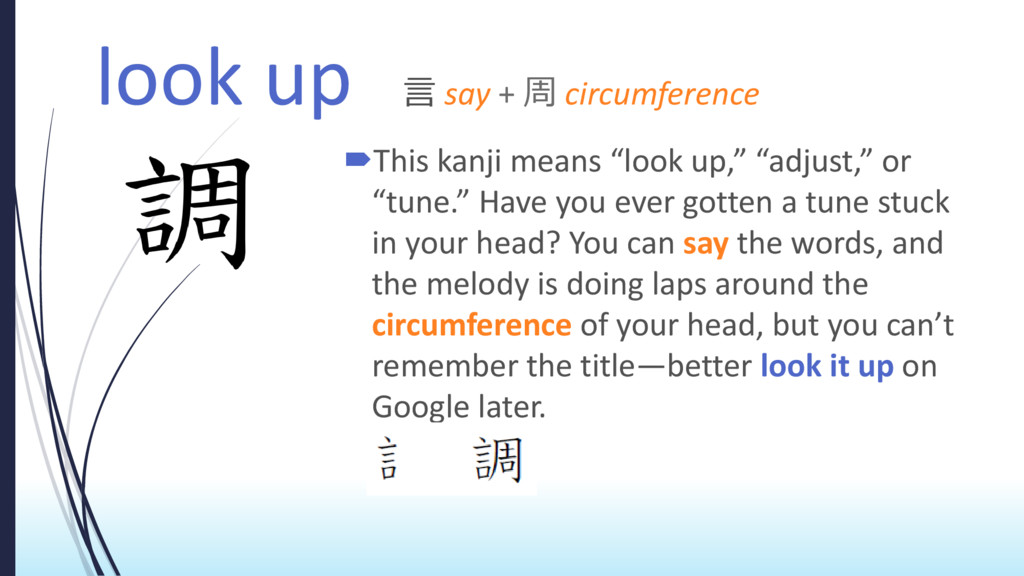 “look up,” “adjust,” or “tune.” Have you ever gotten a tune stuck in your head? You can say the words, and the melody is doing laps around the circumference of your head, but you can’t remember the title—better look it up on Google later.