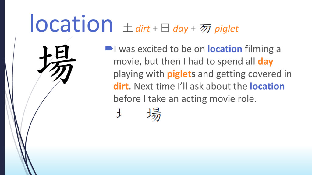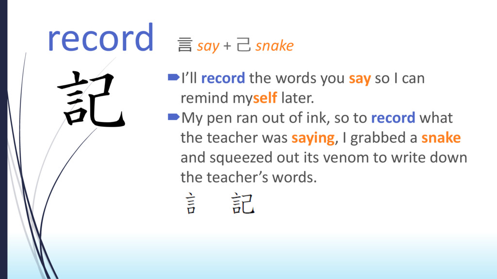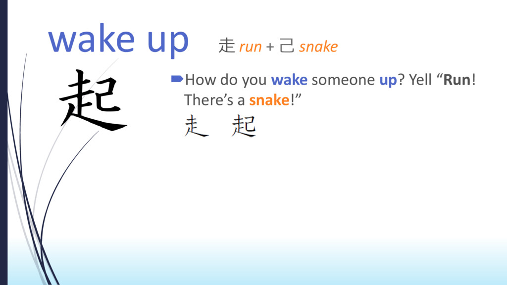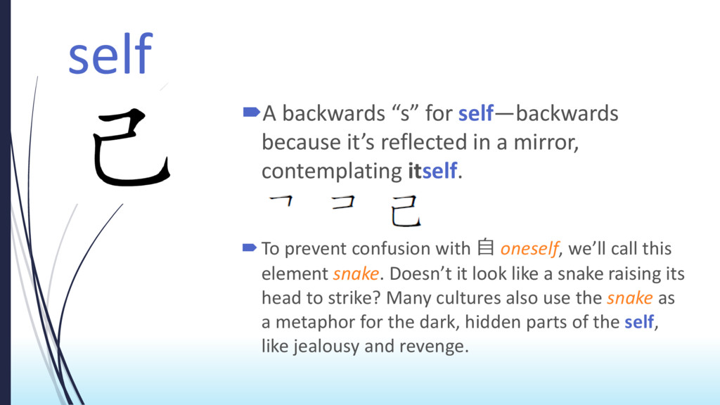 a mirror, contemplating itself. To prevent confusion with 自 oneself, we’ll call this element snake. Doesn’t it look like a snake raising its head to strike? Many cultures also use the snake as a metaphor for the dark, hidden parts of the self, like jealousy and revenge.