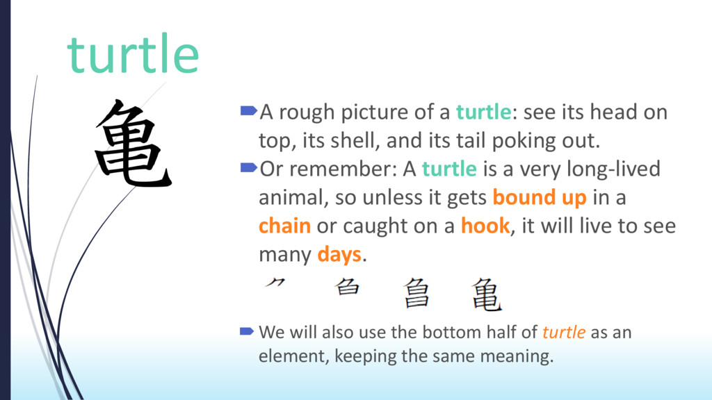 on top, its shell, and its tail poking out. Or remember: A turtle is a very long-lived animal, so unless it gets bound up in a chain or caught on a hook, it will live to see many days. We will also use the bottom half of turtle as an element, keeping the same meaning.