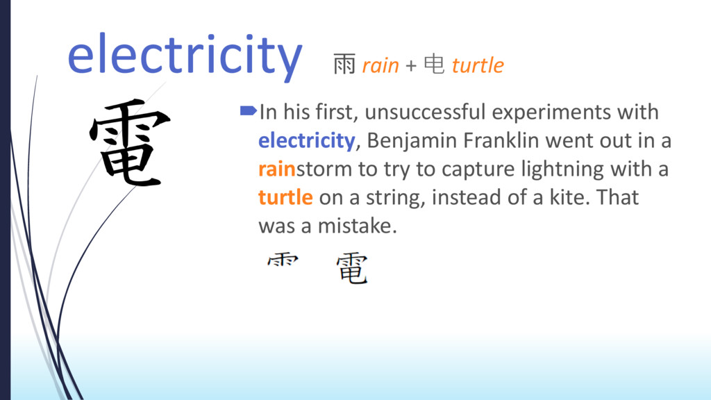 experiments with electricity, Benjamin Franklin went out in a rainstorm to try to capture lightning with a turtle on a string, instead of a kite. That was a mistake.