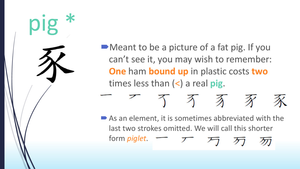 pig. If you can’t see it, you may wish to remember: One ham bound up in plastic costs two times less than (<) a real pig. As an element, it is sometimes abbreviated with the last two strokes omitted. We will call this shorter form piglet.