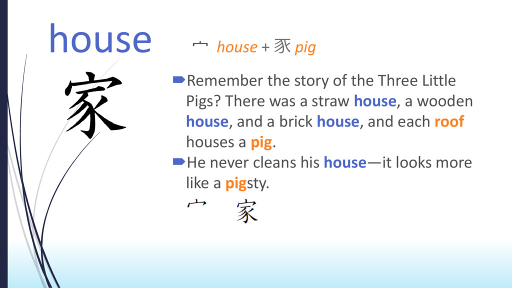 the Three Little Pigs? There was a straw house, a wooden house, and a brick house, and each roof houses a pig. He never cleans his house—it looks more like a pigsty.