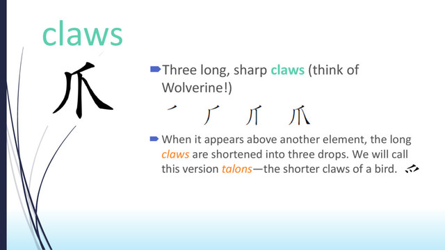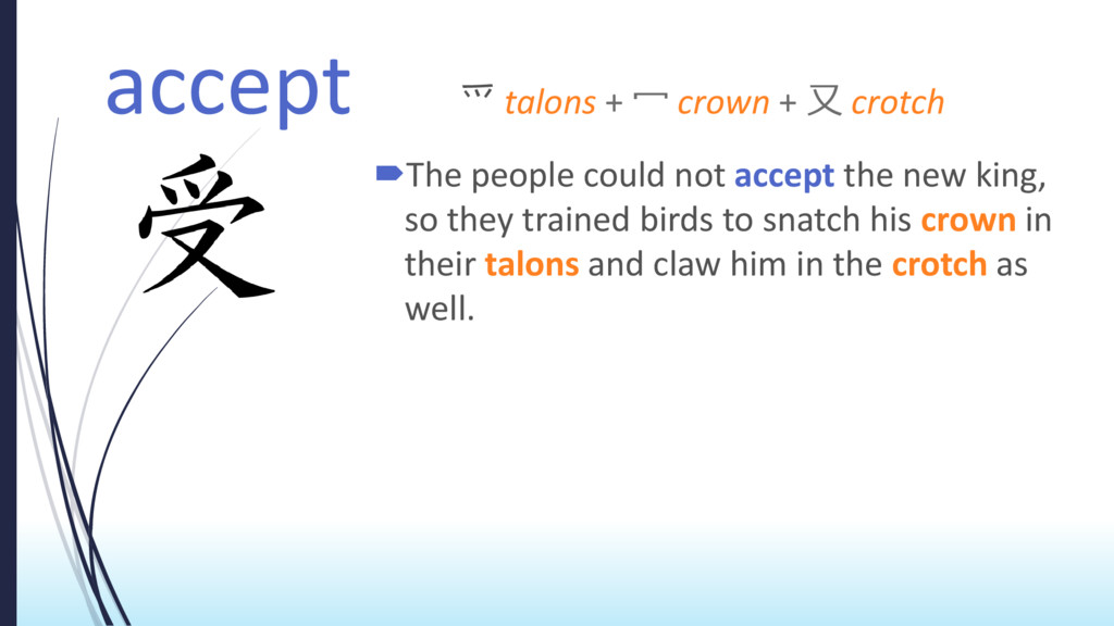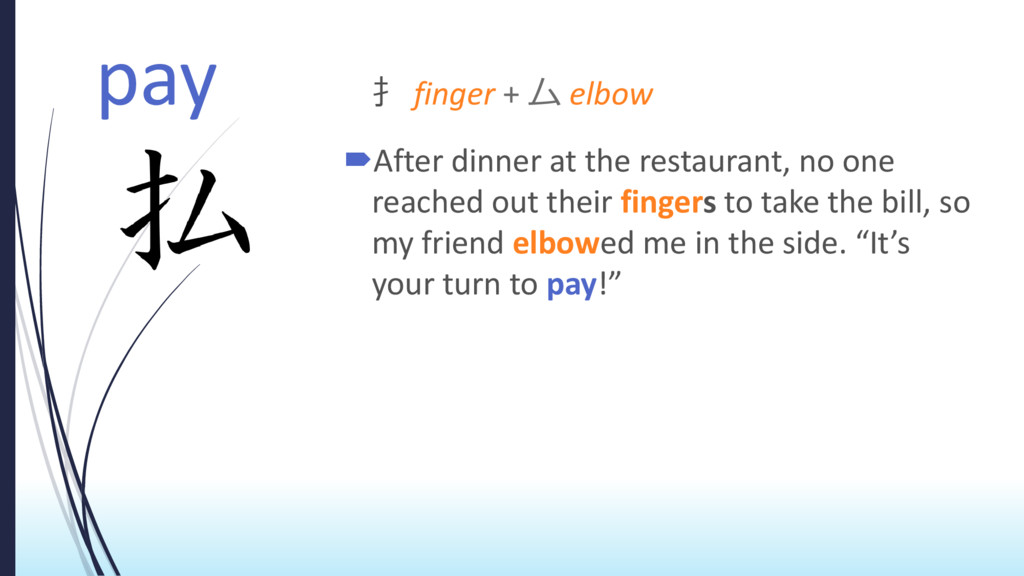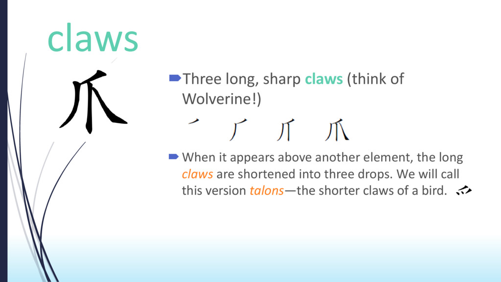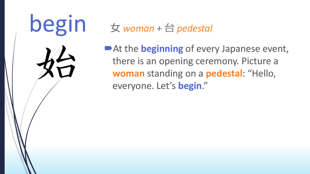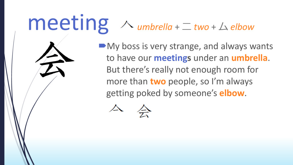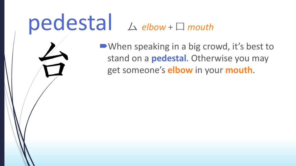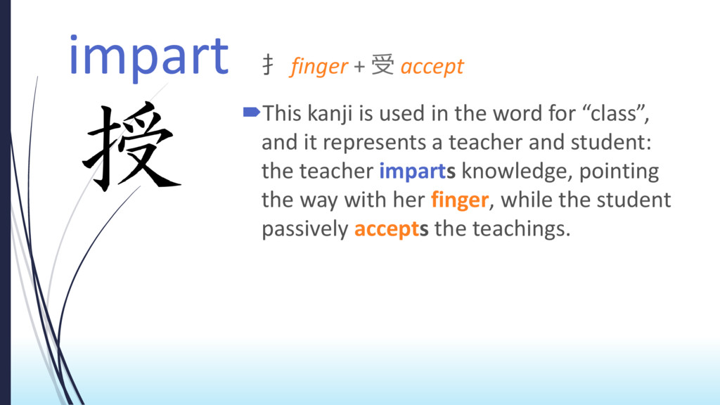 in the word for “class”, and it represents a teacher and student: the teacher imparts knowledge, pointing the way with her finger, while the student passively accepts the teachings.