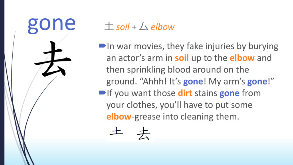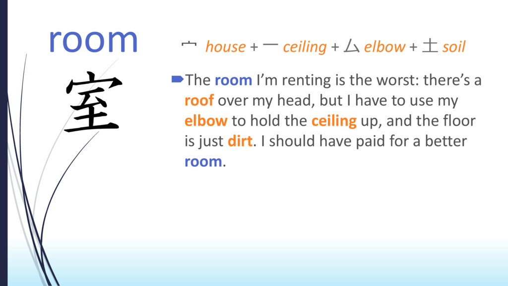 土 soil The room I’m renting is the worst: there’s a roof over my head, but I have to use my elbow to hold the ceiling up, and the floor is just dirt. I should have paid for a better room.