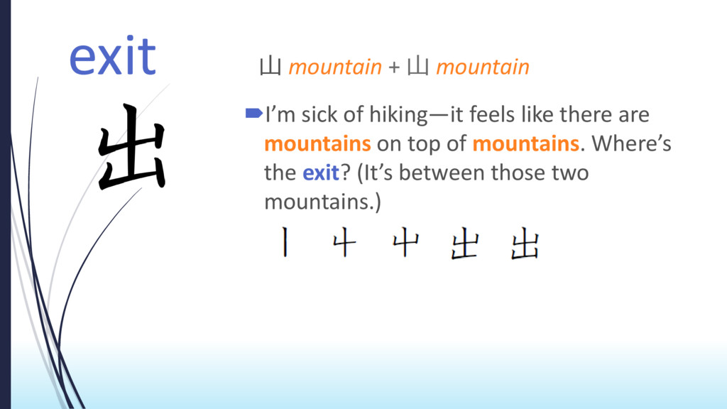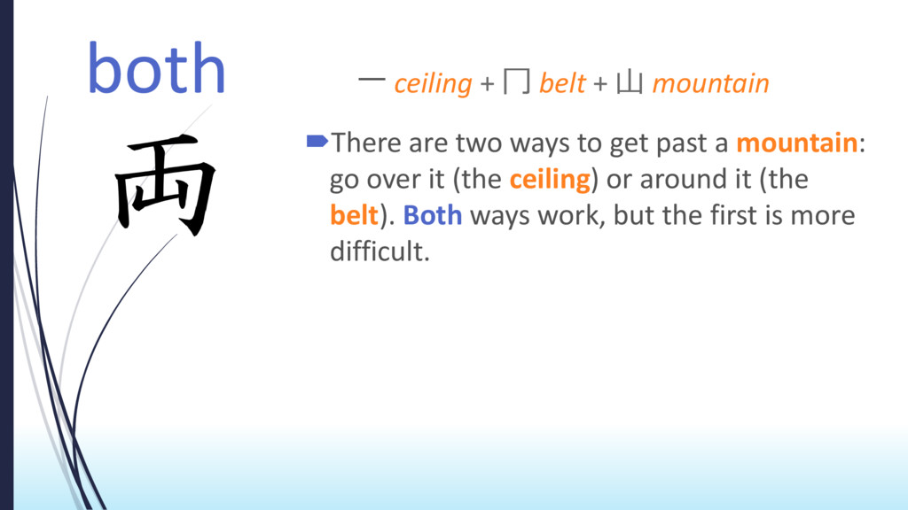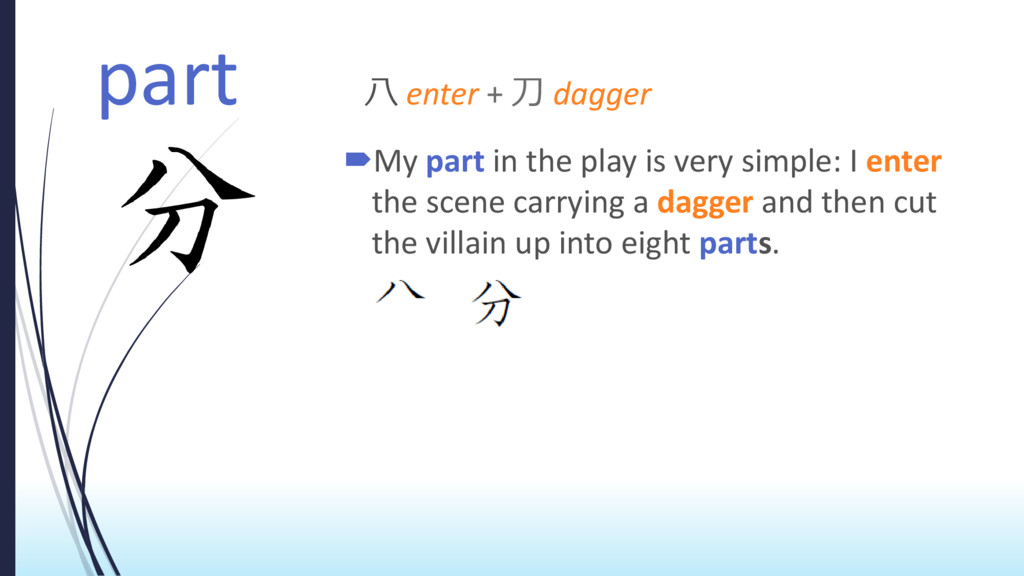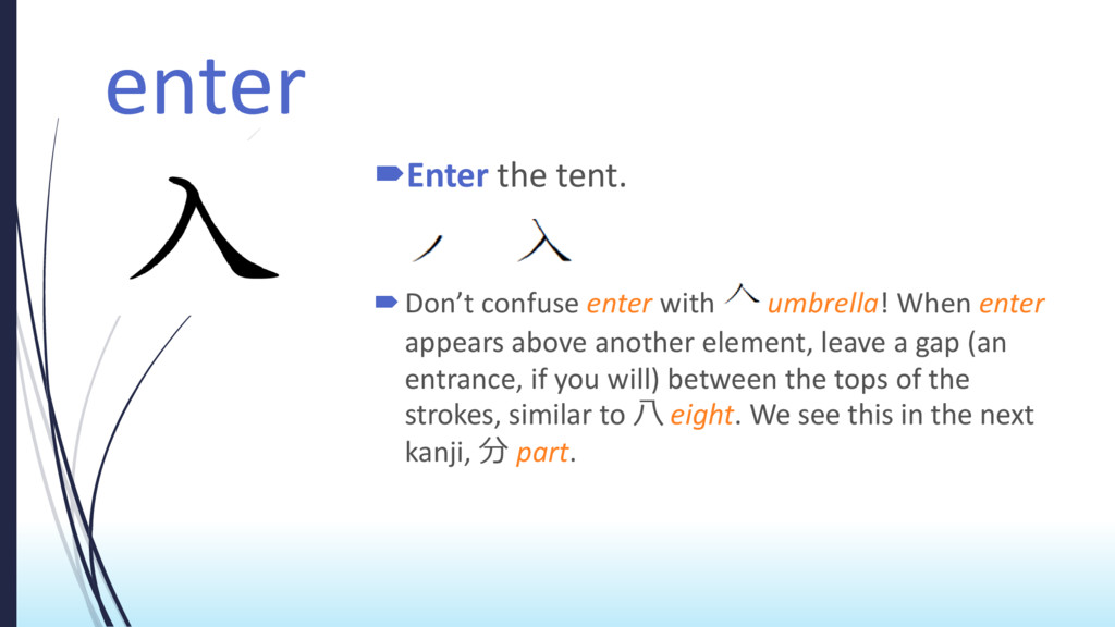 enter appears above another element, leave a gap (an entrance, if you will) between the tops of the strokes, similar to 八 eight. We see this in the next kanji, 分 part.