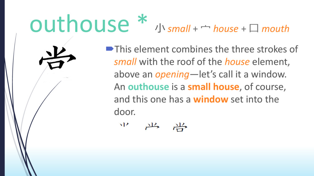 This element combines the three strokes of small with the roof of the house element, above an opening—let’s call it a window. An outhouse is a small house, of course, and this one has a window set into the door.