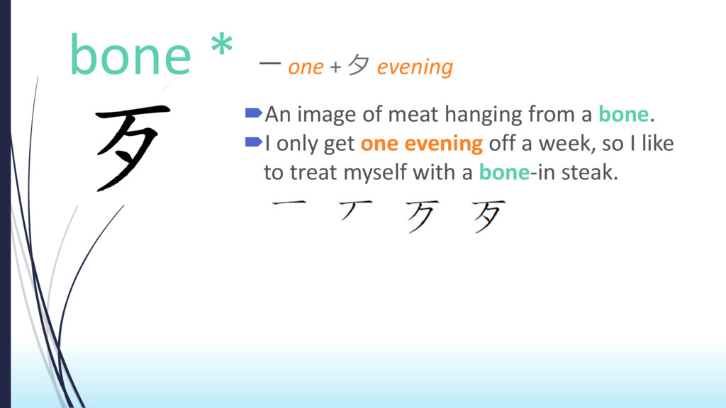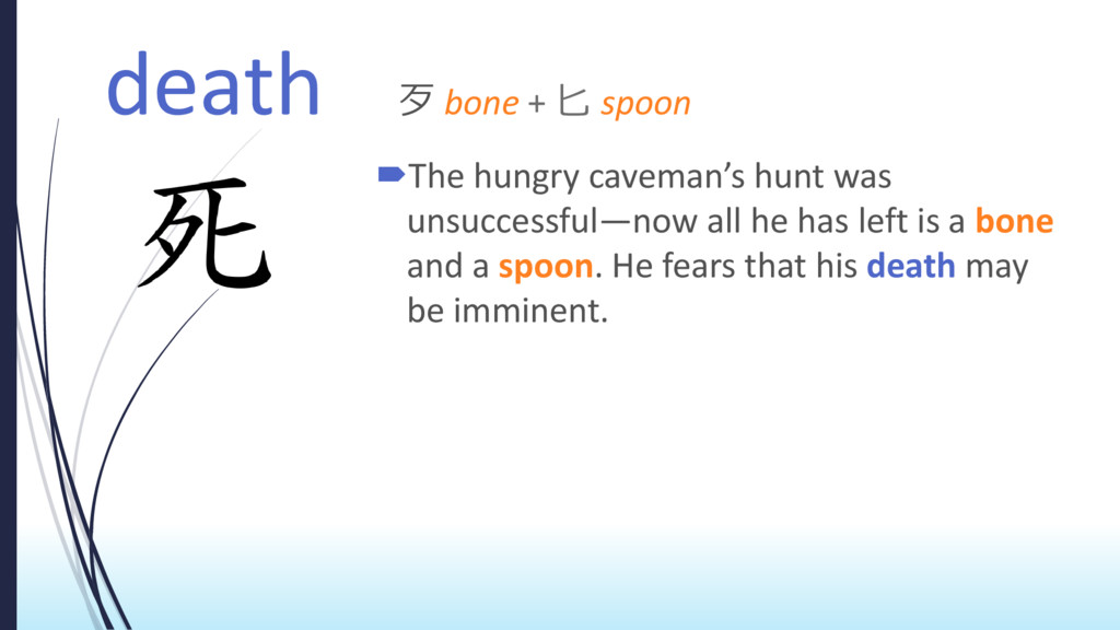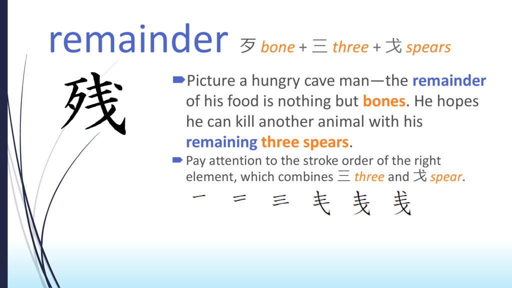 a hungry cave man—the remainder of his food is nothing but bones. He hopes he can kill another animal with his remaining three spears. Pay attention to the stroke order of the right element, which combines 三 three and 戈 spear.