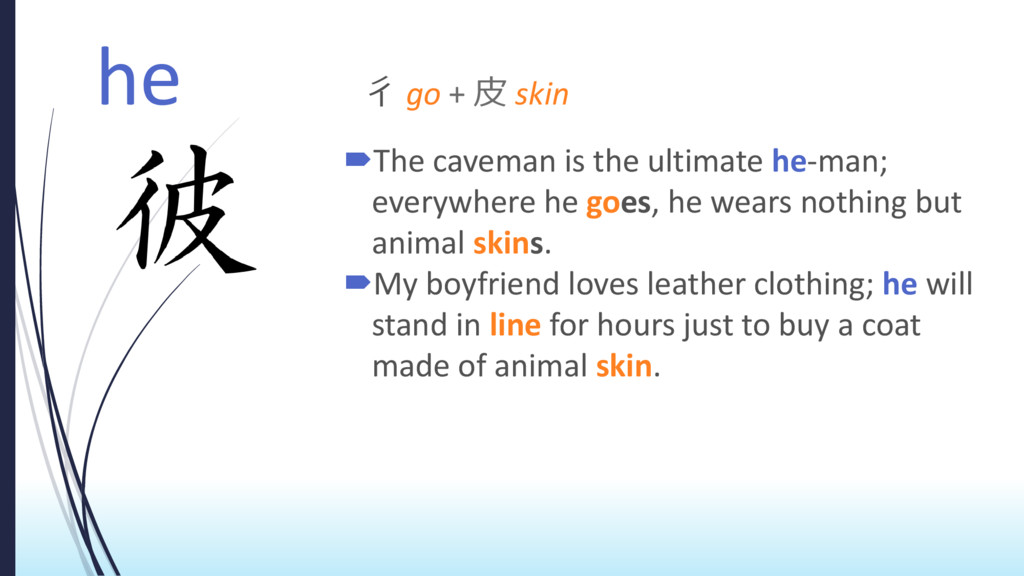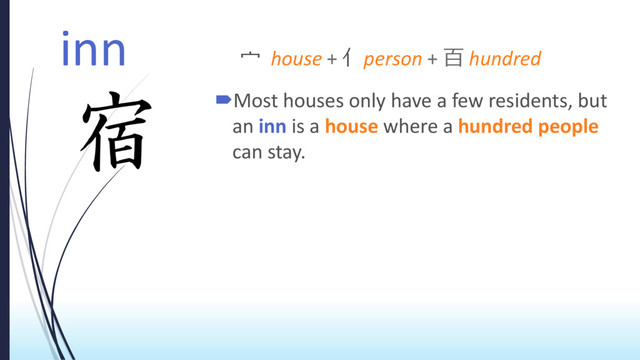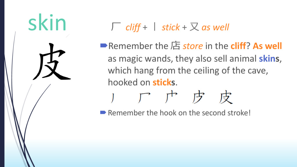 Remember the 店 store in the cliff? As well as magic wands, they also sell animal skins, which hang from the ceiling of the cave, hooked on sticks. Remember the hook on the second stroke!
