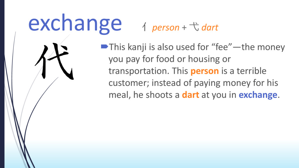 used for “fee”—the money you pay for food or housing or transportation. This person is a terrible customer; instead of paying money for his meal, he shoots a dart at you in exchange.