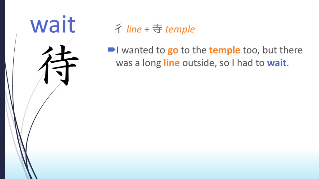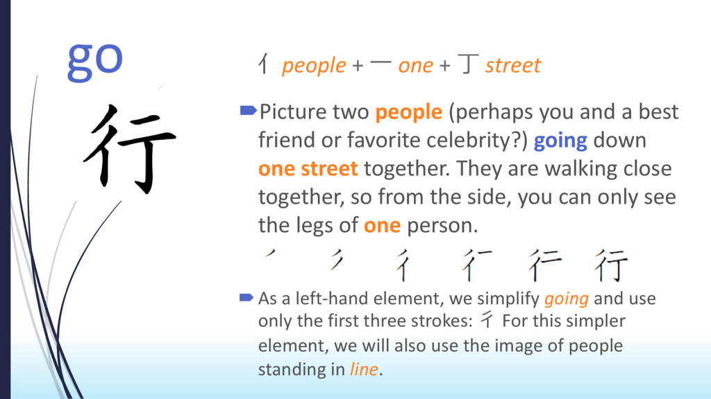 two people (perhaps you and a best friend or favorite celebrity?) going down one street together. They are walking close together, so from the side, you can only see the legs of one person. As a left-hand element, we simplify going and use only the first three strokes: 彳 For this simpler element, we will also use the image of people standing in line.