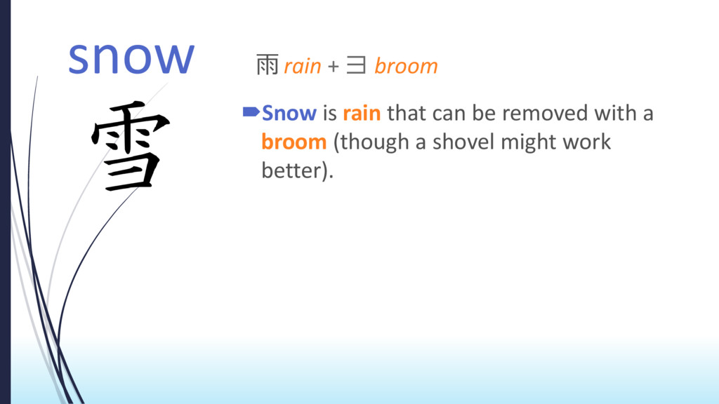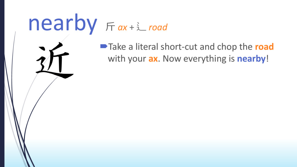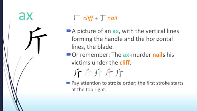 ax, with the vertical lines forming the handle and the horizontal lines, the blade. Or remember: The ax-murder nails his victims under the cliff. Pay attention to stroke order; the first stroke starts at the top right.