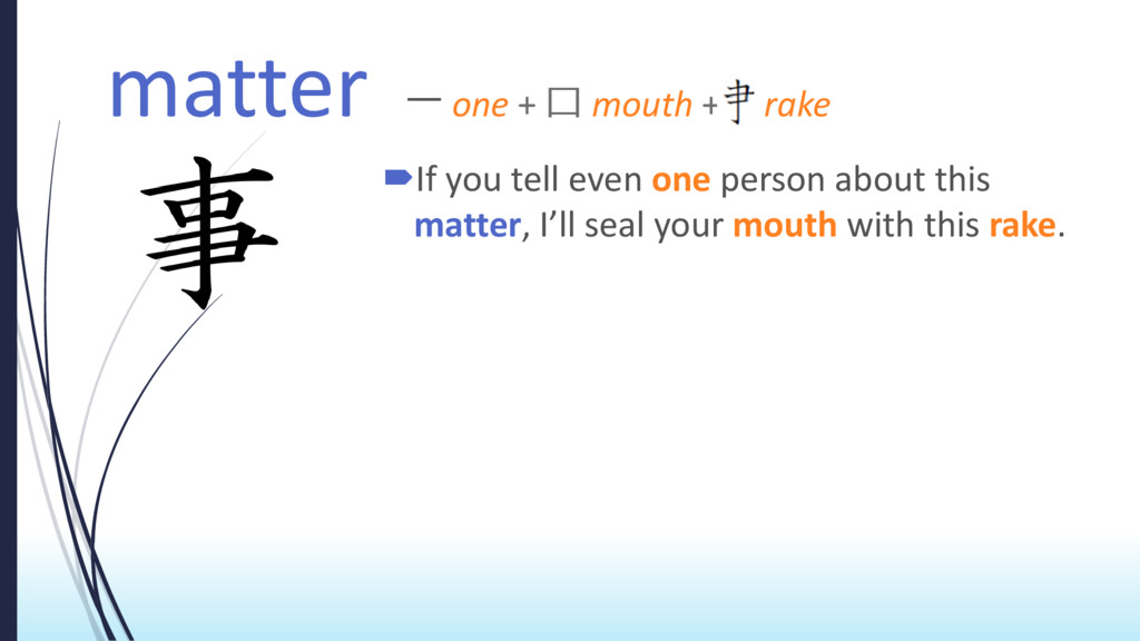 a broom with hooked sticks instead of bristles, making it easy to rake up fallen leaves. The “bristles” of the broom element can slide down the vertical line in order to fit other elements above, as we will see in 事 matter.