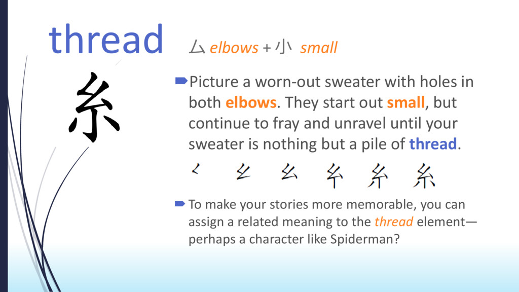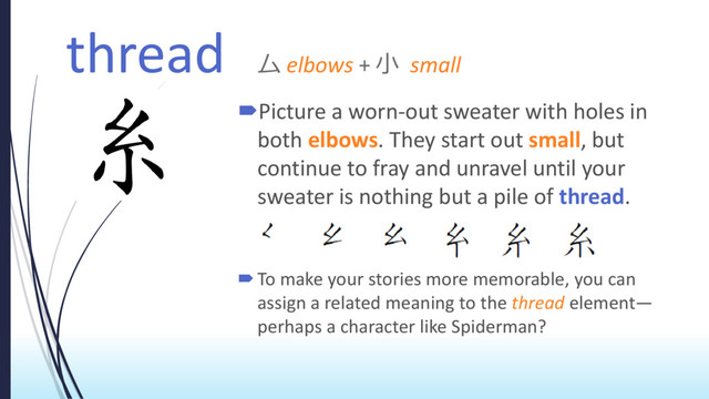 with holes in both elbows. They start out small, but continue to fray and unravel until your sweater is nothing but a pile of thread. To make your stories more memorable, you can assign a related meaning to the thread element— perhaps a character like Spiderman?