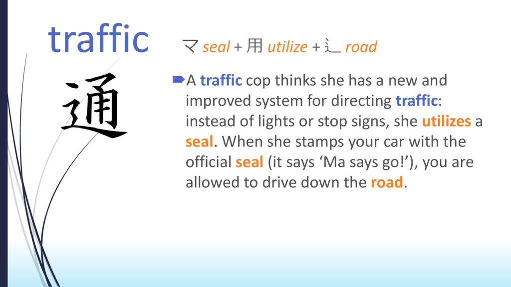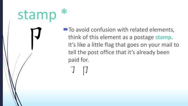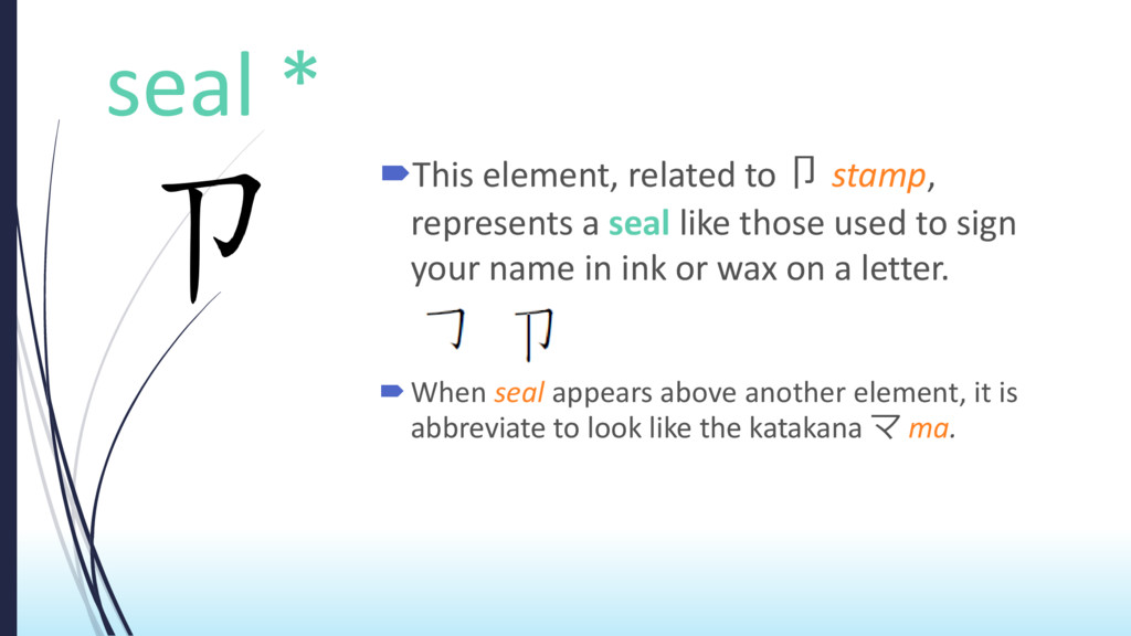 seal like those used to sign your name in ink or wax on a letter. When seal appears above another element, it is abbreviate to look like the katakana マ ma.