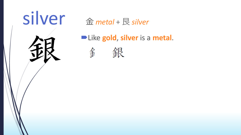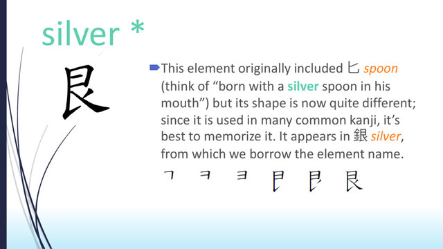 “born with a silver spoon in his mouth”) but its shape is now quite different; since it is used in many common kanji, it’s best to memorize it. It appears in 銀 silver, from which we borrow the element name.