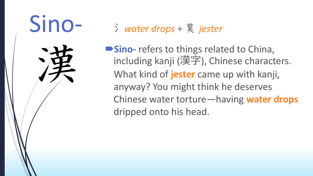 related to China, including kanji (漢字), Chinese characters. What kind of jester came up with kanji, anyway? You might think he deserves Chinese water torture—having water drops dripped onto his head.