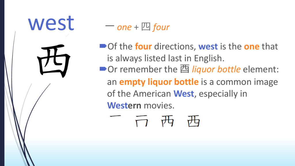 west is the one that is always listed last in English. Or remember the 酉 liquor bottle element: an empty liquor bottle is a common image of the American West, especially in Western movies.