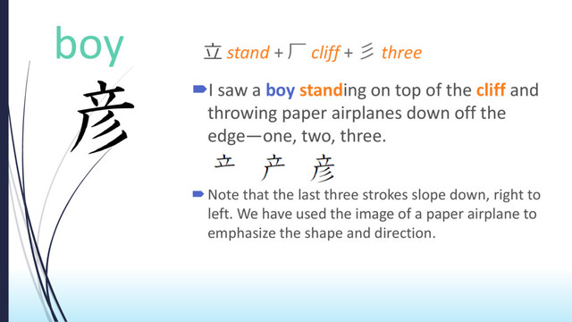 saw a boy standing on top of the cliff and throwing paper airplanes down off the edge—one, two, three. Note that the last three strokes slope down, right to left. We have used the image of a paper airplane to emphasize the shape and direction.