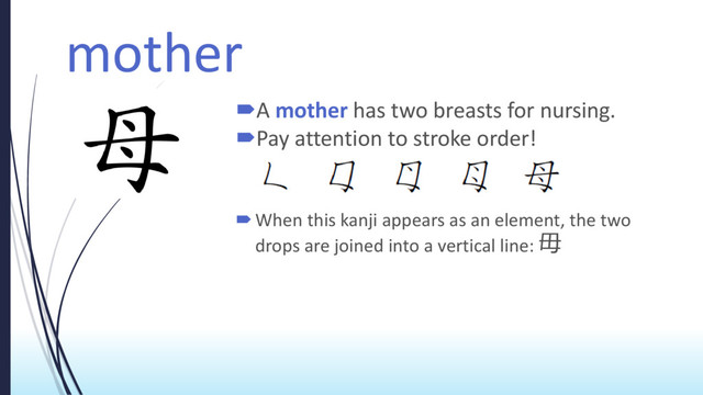 to stroke order! When this kanji appears as an element, the two drops are joined into a vertical line: 毋