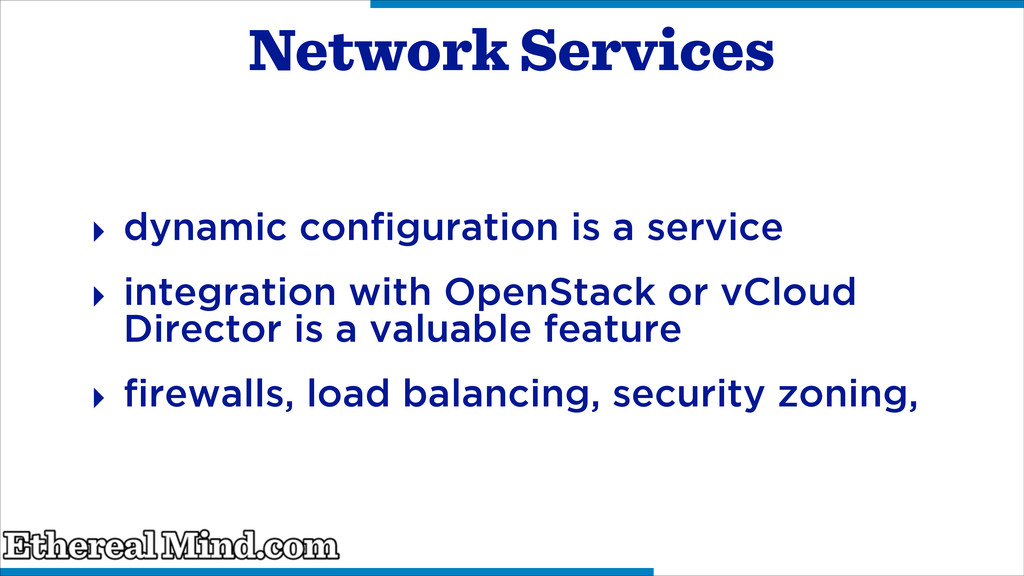 ‣ Firewalls, routers, IDS, ‣ Instead of one big one, have many smaller ones per service ‣ configure HA on a service by service basis ‣ In a cloud, unused VMs don’t consume CPU/Memory and don’t need to be overspecified