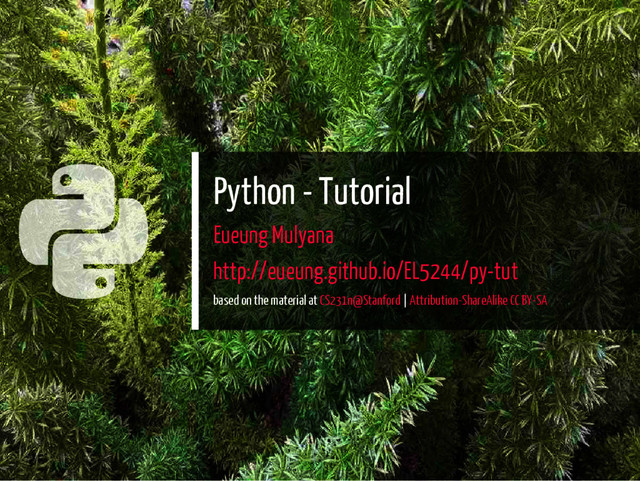 y a s n p a = n p . a r r a y ( [ 1 , 2 , 3 ] ) # C r e a t e a r a n k 1 a r r a y p r i n t t y p e ( a ) # P r i n t s " < t y p e ' n u m p y . n d a r r a y ' > " p r i n t a . s h a p e # P r i n t s " ( 3 , ) " p r i n t a [ 0 ] , a [ 1 ] , a [ 2 ] # P r i n t s " 1 2 3 " a [ 0 ] = 5 # C h a n g e a n e l e m e n t o f t h e a r r a y p r i n t a # P r i n t s " [ 5 , 2 , 3 ] " b = n p . a r r a y ( [ [ 1 , 2 , 3 ] , [ 4 , 5 , 6 ] ] ) # C r e a t e a r a n k 2 a r r a y p r i n t b . s h a p e # P r i n t s " ( 2 , 3 ) " p r i n t b [ 0 , 0 ] , b [ 0 , 1 ] , b [ 1 , 0 ] # P r i n t s " 1 2 4 " # - - - - - a = n p . z e r o s ( ( 2 , 2 ) ) # C r e a t e a n a r r a y o f a l l z e r o s p r i n t a # P r i n t s " [ [ 0 . 0 . ] # [ 0 . 0 . ] ] " b = n p . o n e s ( ( 1 , 2 ) ) # C r e a t e a n a r r a y o f a l l o n e s p r i n t b # P r i n t s " [ [ 1 . 1 . ] ] " c = n p . f u l l ( ( 2 , 2 ) , 7 ) # C r e a t e a c o n s t a n t a r r a y p r i n t c # P r i n t s " [ [ 7 . 7 . ] # [ 7 . 7 . ] ] " d = n p . e y e ( 2 ) # C r e a t e a 2 x 2 i d e n t i t y m a t r i x p r i n t d # P r i n t s " [ [ 1 . 0 . ] # [ 0 . 1 . ] ] " e = n p . r a n d o m . r a n d o m ( ( 2 , 2 ) ) # C r e a t e a n a r r a y f i l l e d w i t h r a n d o m v a l u e s p r i n t e # M i g h t p r i n t " [ [ 0 . 9 1 9 4 0 1 6 7 0 . 0 8 1 4 3 9 4 1 ] # [ 0 . 6 8 7 4 4 1 3 4 0 . 8 7 2 3 6 6 8 7 ] ] " Numpy Numpy is the core library for scientific computing in Python. It provides a high- performance multidimensional array object (MATLAB style), and tools for working with these arrays. Arrays A numpy array is a grid of values, all of the same type, and is indexed by a tuple of nonnegative integers. The number of dimensions is the rank of the array; the shape of an array is a tuple of integers giving the size of the array along each dimension. We can initialize numpy arrays from nested Python lists, and access elements using square brackets. Numpy also provides many functions to create arrays. 19 / 42