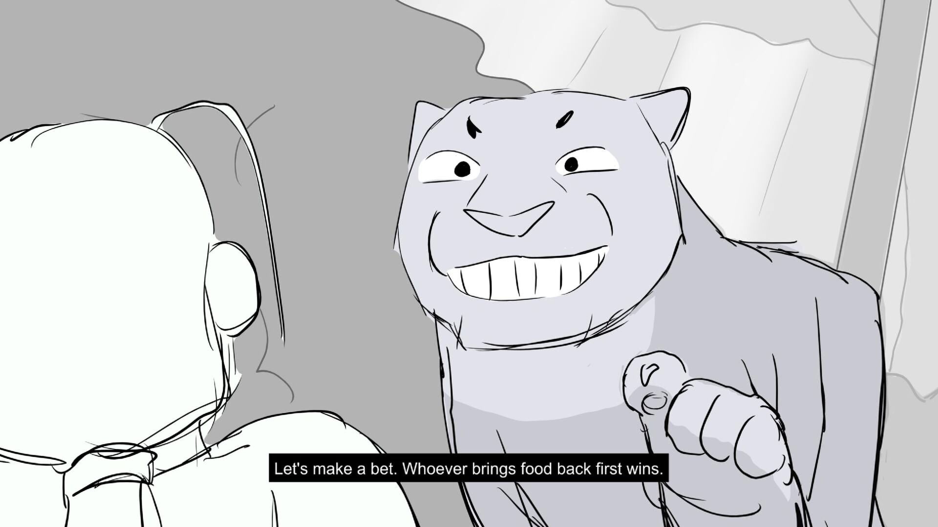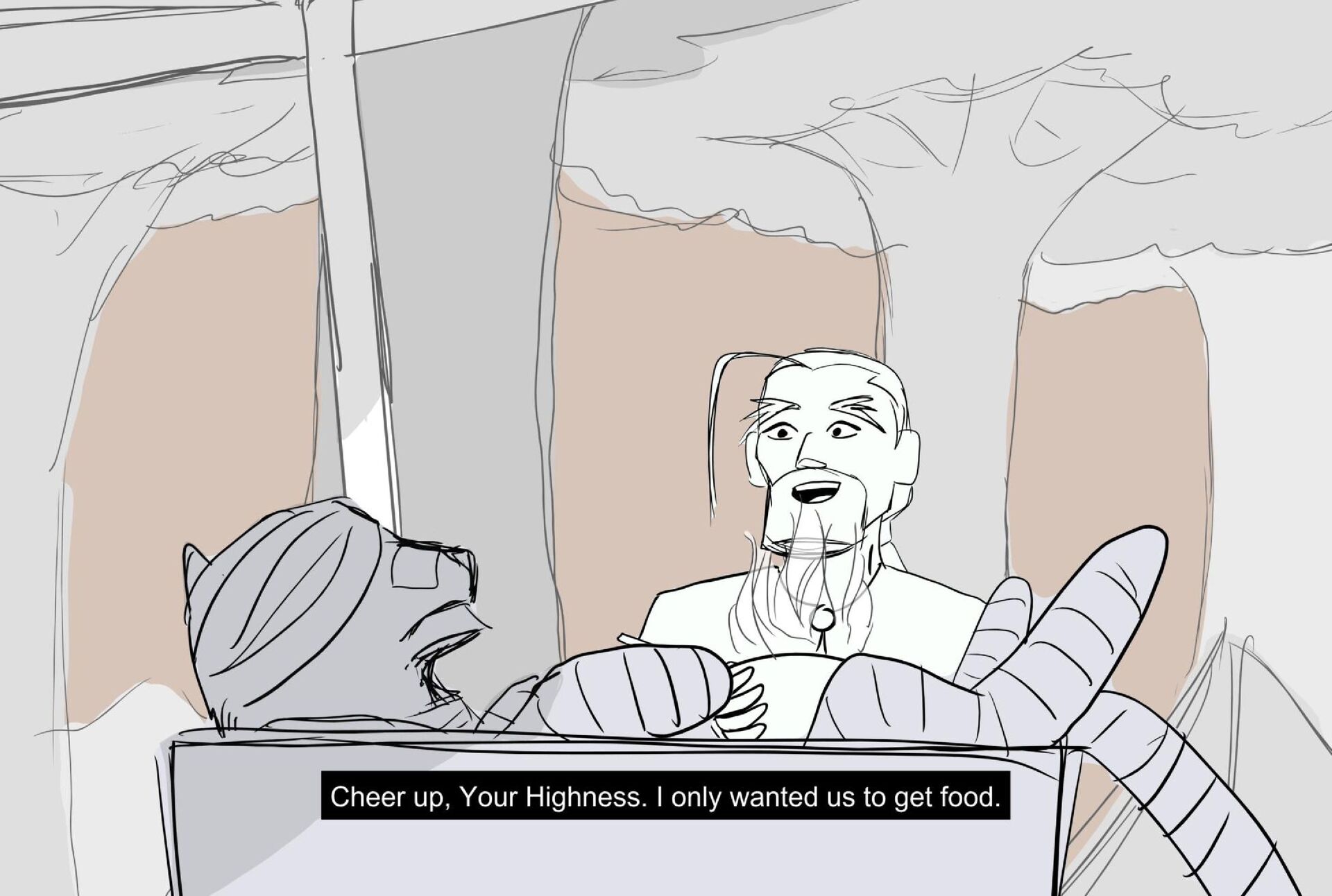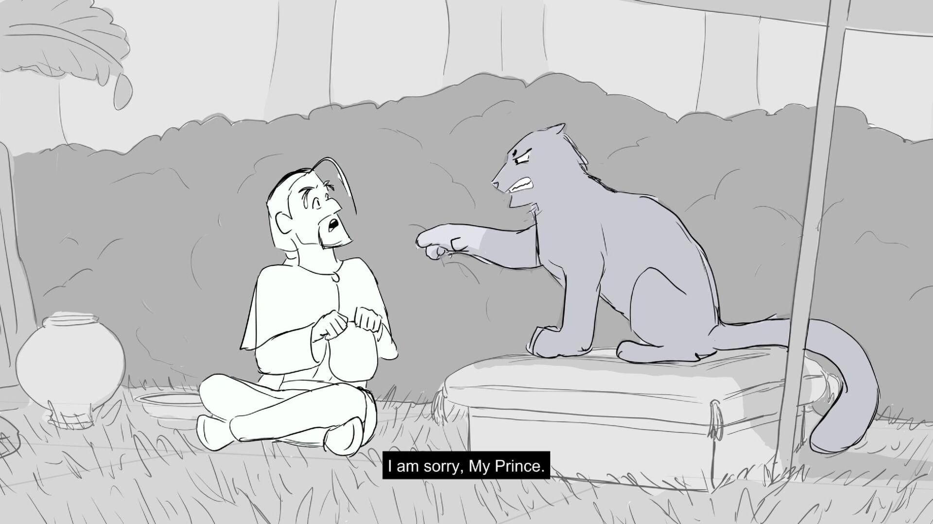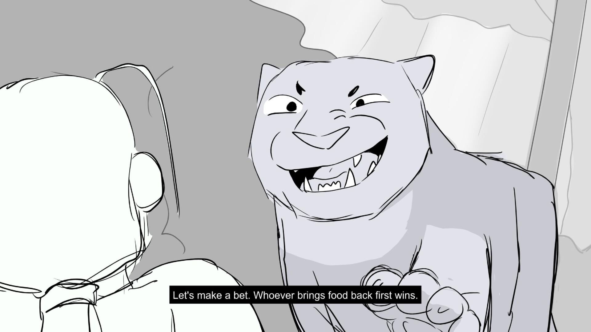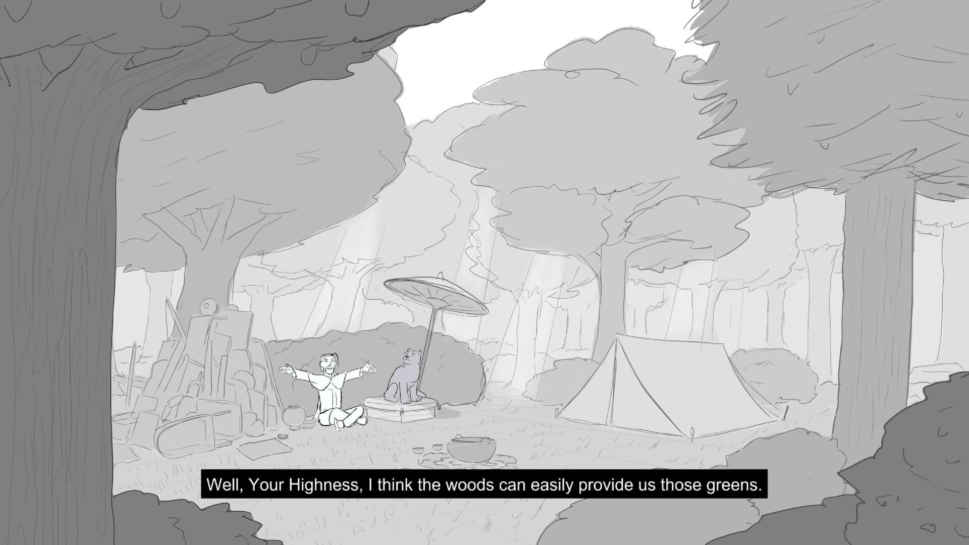 A cursed prince and his tutor are on a journey to undo said curse. Along the way, they ran out of food, so the prince made a bet on how to obtain food. His method of winning the bet hit upon a series of mishaps.